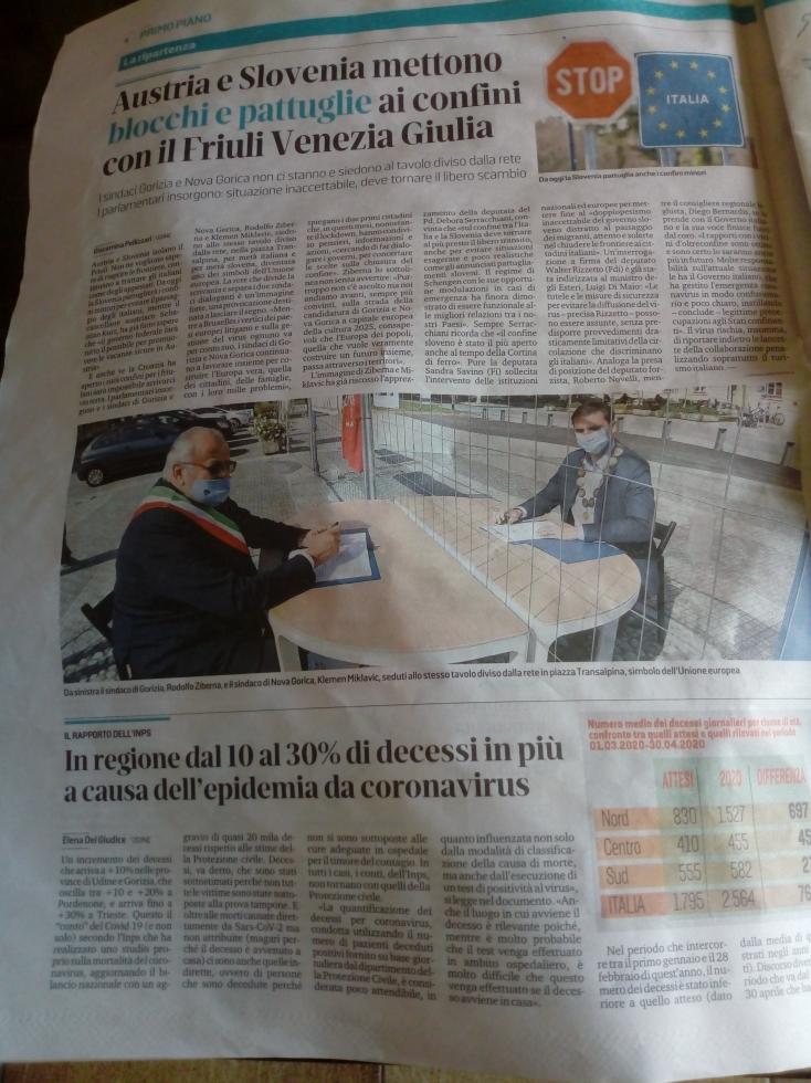 Alcuni sindaci insorgono e quello di Gorizia e di Nova Gorica (l'altra parte di Gorizia rimasta in mano Slovena) si sono riuniti a ridosso della rete divisoria con due tavoli che, accostati, fanno un cerchio unico.