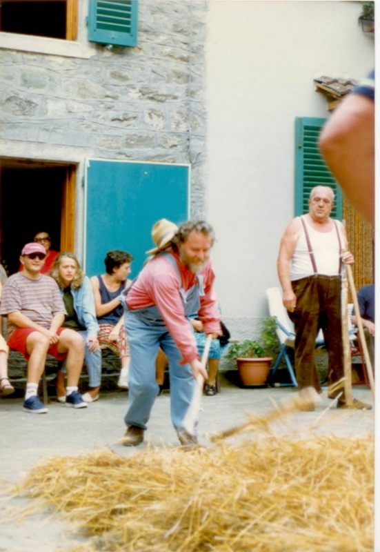 Stesi i bianchi teli sul pietroso selciato, sciolti i covoni del grano, adagiato in file uniformi, inizia la battitura. Voci di incitamento, vorticano i corgiali nell’aria gaia, batte il legno sul grano,. saltano i chicchi liberati dalla spiga.