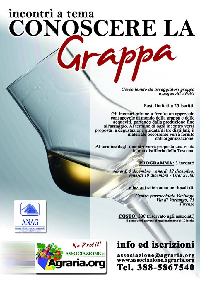 Tre incontri sul tema della grappa organizzati dall'Associazione di Agraria.org e ANAG assaggiatori grappe e acquaviti. Durante ogni incontro verrà proposta la degustazione guidata di tre distillati. Successivamente verrà effettuata una visita in una distilleria della Toscana.