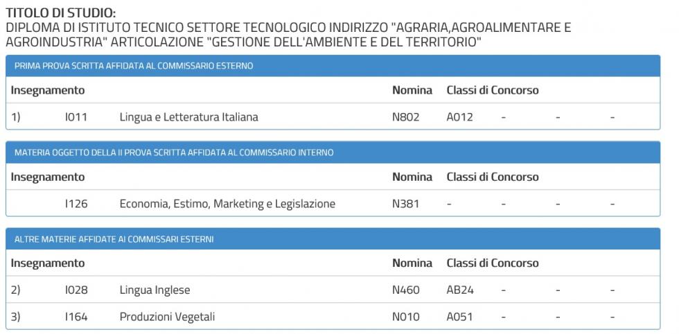 PRIMA PROVA SCRITTA AFFIDATA AL COMMISSARIO ESTERNO 1) LINGUA E LETTERATURA ITALIANA MATERIA OGGETTO DELLA II PROVA SCRITTA AFFIDATA AL COMMISSARIO INTERNO - GESTIONE DELL'AMBIENTE E DEL TERRITORIO ALTRE MATERIE AFFIDATE AI COMMISSARI ESTERNI 2) LINGUA INGLESE 3) PRODUZIONI VEGETALI