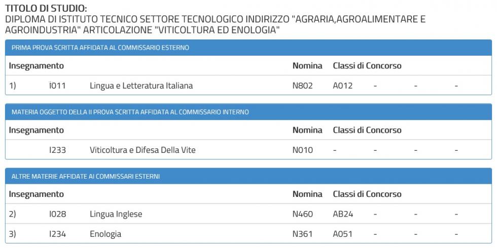 PRIMA PROVA SCRITTA AFFIDATA AL COMMISSARIO ESTERNO 1) LINGUA E LETTERATURA ITALIANA MATERIA OGGETTO DELLA II PROVA SCRITTA AFFIDATA AL COMMISSARIO INTERNO - ENOLOGIA ALTRE MATERIE AFFIDATE AI COMMISSARI ESTERNI 2) LINGUA INGLESE 3) VITICOLTURA E DIFESA DELLA VITE