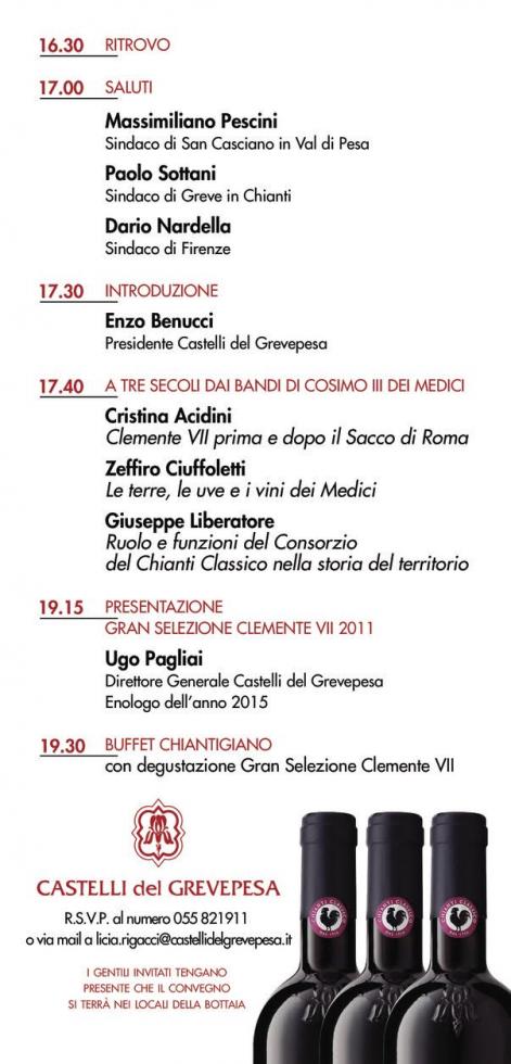 IL CHIANTI CLASSICO A TRE SECOLI DAI BANDI DI COSIMO III Un evento organizzato ieri da Castelli del Grevepesa nelle proprie cantine ha celebrato l’anniversario dei trecento anni della più antica denominazione italiana con la presentazione del Chianti Classico “Gran Selezione Clemente VII" _________________________ Firenze, 21 maggio 2015 – Raccontare un evento storico attraverso una testimonianza unica: il vino. E’ quello che Castelli del Grevepesa ha voluto fare organizzando nelle proprie cantine a San Casciano Val di Pesa (Firenze) un evento per ricordare i trecento anni dai bandi di Cosimo III. «A distanza di 25 anni dalla prima bottiglia di Chianti Classico Clemente VII, vino che anno dopo anno ha conquistato importanti successi in ogni mercato, abbiamo voluto rendere omaggio a questo illustre chiantigiano d’adozione con la produzione della Gran Selezione». Lo ha affermato Ugo Pagliai, Direttore Generale di Castelli del Grevepesa, la più grande cantina produttrice di vini Chianti Classico. «Abbiamo diciotto vigneti coltivati intorno a quella Pieve di Campòli, – spiega Pagliai – che il Cardinale Giulio de’ Medici, ancor prima di salire al soglio pontificio nel 1523 con il nome di Clemente VII, per la dolcezza delle colline circostanti apprezzava come soggiorno prediletto. La nostra azienda da sempre seleziona le proprie uve per ottenere vini unici ed originali che possano esprimere le eccellenze dai migliori vigneti. Per questo, nel solco dei successi del nostro Clemente VII, finora realizzato nelle tipologie “Annata” e “Riserva” abbiamo ritenuto importante cimentarci anche nella produzione limitata di “Gran Selezione”, massima espressione della piramide qualitativa del Chianti Classico». Nel corso dell’evento hanno preso la parola esperti e storici, per sottolineare l’importanza della famiglia dei Medici per l’avvenire del vino toscano. «I Medici, del resto – ha illustrato durante la serata, il Prof. Zeffiro Ciuffoletti, noto storico dell’Università di Firenze e appassionato di vicende chiantigiane, non furono soltanto abilissimi mercanti e straordinari mecenati, ma come “Principi”, con saggezza e lungimiranza capirono che valorizzare le risorse naturali ed i frutti della terra avrebbero concorso in modo significativo ad arricchire la propria Signoria: il Bando di Cosimo III, che per la prima volta nel mondo, definisce le zone vinicole, ne è eloquente riprova». “Protagonista di uno dei momenti più drammatici della storia del Pontificato, eppure uomo politico dai tratti umani”. Così, Clemente VII nel piacevole intervento di Cristina Acidini, già Sovrintendente del Polo Museale fiorentino. “Un uomo che non si arrende, - ha raccontato la nota storica d’arte - perché essere Papa vuol dire essere scelti per mandato divino sono le impronte che si colgono nelle raffigurazioni lasciate dal Vasari a Palazzo Vecchio” e che il Sindaco di Firenze ha concesso in uso a Castelli del Grevepesa, perché la preziosa ricchezza del patrimonio culturale fiorentino sono valore aggiunto per l’economia del territorio. Tra i partecipanti all’iniziativa anche il Consorzio del Chianti Classico che proprio nel 2016 ha organizzato vari eventi dai trecento anni dall’editto. «I vini toscani concorrono fortemente al successo dell’economia agroalimentare del nostro Paese, ed il Chianti Classico che nell’ultimo anno ha ulteriormente incrementato le proprie esportazioni - ha aggiunto Giuseppe Liberatore, Direttore Generale dell’omonimo consorzio - nel 2016 celebra i suoi trecento anni di storia da quel 24 settembre 1716, quando il Granduca Cosimo III de’ Medici decise di delimitare con un bando, per la prima volta nella storia, alcuni territori particolarmente vocati per la produzione di vini di alta qualità». “Una storia secolare, insomma, ha concluso, il Prof. Enzo Benucci, presidente dell’azienda, che, dopo tre secoli, sorso dopo sorso, continua ad affascinare i consumatori di tutto il mondo!” Castelli del Grevepesa, il maggior produttore di Chianti Classico. Nella convinzione che l’incanto delle colline chiantigiane siano un prodigio della civiltà fiorentina con il concorso benevolo di una natura dispensatrice di frutti di gran pregio, da cinquant’anni Castelli del Grevepesa concorre a valorizzare la viticoltura toscana perseguendo l’obiettivo di produrre qualità, creando giorno dopo giorno innovazioni di prodotto nel rispetto delle tradizioni secolari. Con tre milioni di bottiglie chianti classico prodotte, un volume di affari nel 2015 di tredici milioni di euro realizzato per oltre la metà oltreconfine, Castelli del Grevepesa è oggi il maggiore produttore imbottigliatore di vini del chianti classico. Castelli del Grevepesa può contare circa 120 vigneti, che si estendono principalmente nelle zone di Greve in Chianti, Mercatale Val di Pesa, San Casciano Val di Pesa, Tavarnelle Val di Pesa e Barberino Val d’Elsa. I vigneti coltivati da Castelli del Grevepesa sono seguiti scrupolosamente dalle potature invernali alla vendemmia da uno staff di agronomi con lo scopo di verificare lo stato dei vigneti in base all’andamento stagionale. Le uve sono preliminarmente controllate nel proprio laboratorio prima della raccolta fino alla vinificazione dai cantinieri guidati dall’Enotecnico Stefano Mosele che ha l’importante compito di seguire tutto il processo di produttivo, differenziandolo a seconda delle diverse varietà di uve e delle loro caratteristiche con particolare attenzione alla fermentazione alcolica, alla svinatura, al controllo della fermentazione malolattica, ai successivi travasi, alla fase di affinamento in botti e barrique, fino ad arrivare all’imbottigliamento. Ogni operazione è scrupolosamente verificata dall’Enologo Ugo Pagliai, Direttore Generale dell’azienda