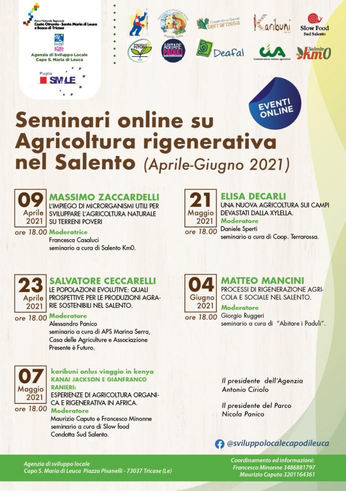 Incontreremo *Massimo Zaccardelli*, dirigente di ricerca presso il CREA, per l'incontro dal titolo *L’impiego di microrganismi utili per sviluppare agricoltura naturale su terreni poveri*, in cui illustrerà esempi, metodi e sperimentazioni dell'utilizzo di microrganismi in agricoltura. Il ciclo di incontri è organizzato dal Parco Costa Otranto - Santa Maria di Leuca e Bosco di Tricase, dall’Agenzia di Sviluppo Locale GAL Capo S. Maria di Leuca e Smile Puglia, supportati da associazioni e cooperative presenti nel Salento.