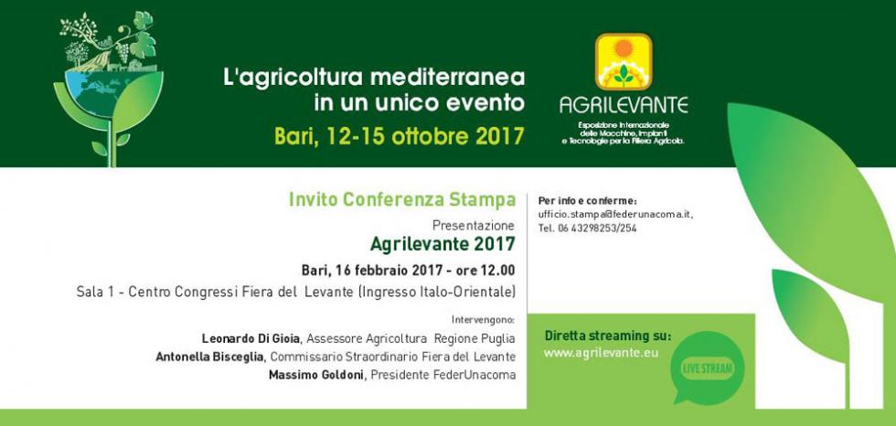 Per presentare Agrilevante 2017 che si terrà a Bari, dal 12 al 15 Ottobre, FederUnacoma terrà una conferenza stampa di presentazione della manifestazione il 16 febbraio 2017 alle ore 12, presso la Sala 1 del Centro Congressi Fiera del Levante (ingresso Italo-Orientale). Prenderanno parte alla presentazione l’Assessore all’Agricoltura Regione Puglia Leonardo Di Gioia, il Commissario Straordinario Fiera del Levante Antonella Bisceglia e il Presidente di FederUnacoma Massimo Goldoni. La manifestazione è dedicata a macchine, impianti e a tecnologie per l'agricoltura e rappresenta la manifestazione più importante in campo agricolo non solo per il centro e il sud Italia, ma per l’intero bacino mediterraneo, l'Europa balcanica e il Medio Oriente.