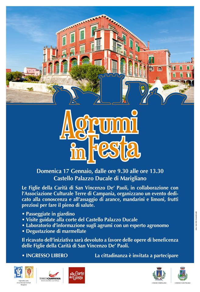 "Agrumi in Festa", domenica 17 gennaio 2016, presso il Castello Palazzo Ducale di Marigliano (NA). L'iniziativa è organizzata dalle Figlie della Carità di San Vincenzo De' Paoli in collaborazione con l'Associazione Culturale Terre di Campania, ed è dedicata alla valorizzazione di arance, limoni e mandarini, frutti importanti per la nostra salute.