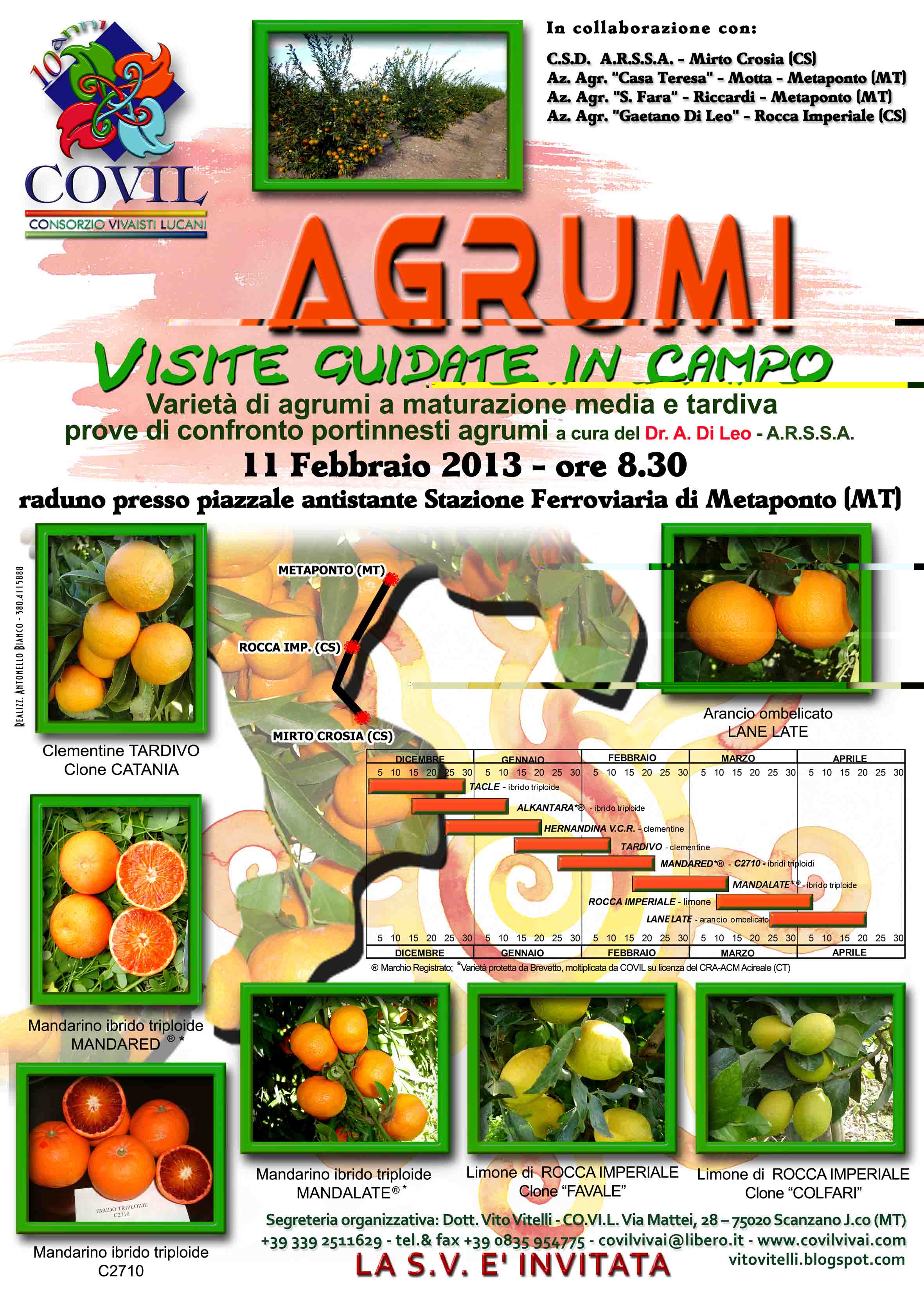 L’11 febbraio 2013 il CO.VI.L. (Consorzio Vivaisti Lucani) organizza visite guidate agli impianti in produzione delle varietà di agrumi, clementine, mandarino-simili, aranci, ibridi, limoni, a maturazione medio-tardiva e tardiva. La giornata tecnica si articolerà in un percorso a tappe, tra gli agrumeti dell’arco ionico da Metaponto (MT) a Mirto Crosia (CS). Nel corso della giornata sarà approfondito il tema dei portinnesti degli agrumi a cura del Dott. Antonio Di Leo del CSD ARSSA - Mirto Crosia (CS).
