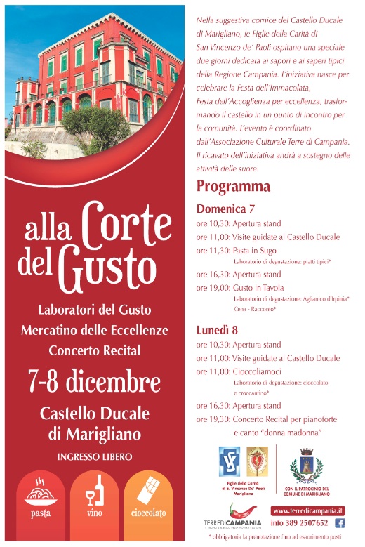 Nella suggestiva cornice del Castello-Palazzo Ducale di Marigliano, le Figlie della Carità di San Vincenzo de’ Paoli, organizzano una speciale due giorni dedicata ai sapori e ai saperi tipici della Regione Campania. L’iniziativa, dal titolo “alla Corte del Gusto”, nasce per celebrare la Festa dell’Immacolata, Festa dell’Accoglienza per eccellenza, che per l’occasione vede il Castello-Palazzo Ducale di Marigliano diventare un punto di incontro per la comunità, nonché luogo di aggregazione durante tutto il corso dell’anno. Il 7 e l’8 dicembre sarà possibile partecipare, presso lo storico edificio sito nel cuore del centro storico di Marigliano, ad una ricca due giorni caratterizzata da un programma di eventi dedicato esclusivamente alla scoperta di alcune delle eccellenti tipicità eno-gastronomiche del nostro territorio. Si comincia domenica 7 con il laboratorio di degustazione “Pasta in sugo”, dedicato alla scoperta di uno degli alimenti tradizionali della Dieta Mediterranea e cibo per eccellenza del mondo contadino, che sarà assaporato con e senza condimento in modo da poterne conoscere e apprezzarne tutte le caratteristiche. La sera dello stesso giorno sarà possibile partecipare, invece, ad una degustazione guidata del rinomato vino Aglianico della provincia di Avellino, seguita da una cena-racconto in cui saranno illustrati, dagli stessi produttori, gli ingredienti utilizzati nella preparazione dei piatti abbinati agli eccellenti vini irpini. La mattina di lunedì 8 sarà aperta da un nuovo laboratorio di degustazione dal titolo “Cioccoliamoci”: un modo nuovo e divertente per scoprire i benefici e la bontà del cioccolato, utilizzato anche come ingrediente del gustoso croccantino di San Marco dei Cavoti. Il laboratorio sarà arricchito da una dimostrazione delle tecniche di lavorazione utilizzate per creare queste imperdibili delizie. Per tutti e due i giorni dell’evento, all’interno della corte del Castello-Palazzo Ducale, i visitatori potranno passeggiare tra i “Mercatini delle Eccellenze“ con stand espositivi ospiteranno aziende operanti nei diversi settori dell’agro-alimentare, che proporranno in degustazione i loro prodotti, che sarà possibile assaggiare e acquistare per l’occasione. Infine, speciali visite guidate al giardino e alla corte del Castello-Palazzo Ducale condurranno i partecipanti all’evento alla scoperta della storia di uno dei luoghi simbolo del passato della Città di Marigliano. A conclusione della due giorni, la sera dell’8 dicembre, sarà possibile assistere al Concerto Recital “Donna Madonna”, per pianoforte e canto dedicato alla Vergine Maria nel giorno che ricorda la sua Immacolata Concezione. Un’iniziativa da non perdere, tra storia, gusto e spettacolo, senza dimenticare la solidarietà e la beneficenza, altro importante motivo per cui è nato l’evento. Il ricavato della partecipazione ai laboratori di degustazione e alla cena-racconto (ad entrambi è possibile partecipare solo previa prenotazione), andrà infatti a sostegno delle attività benefiche delle Figlie della Carità di San Vincenzo de’ Paoli. L’evento è organizzato in collaborazione con l’Associazione Culturale Terre di Campania.