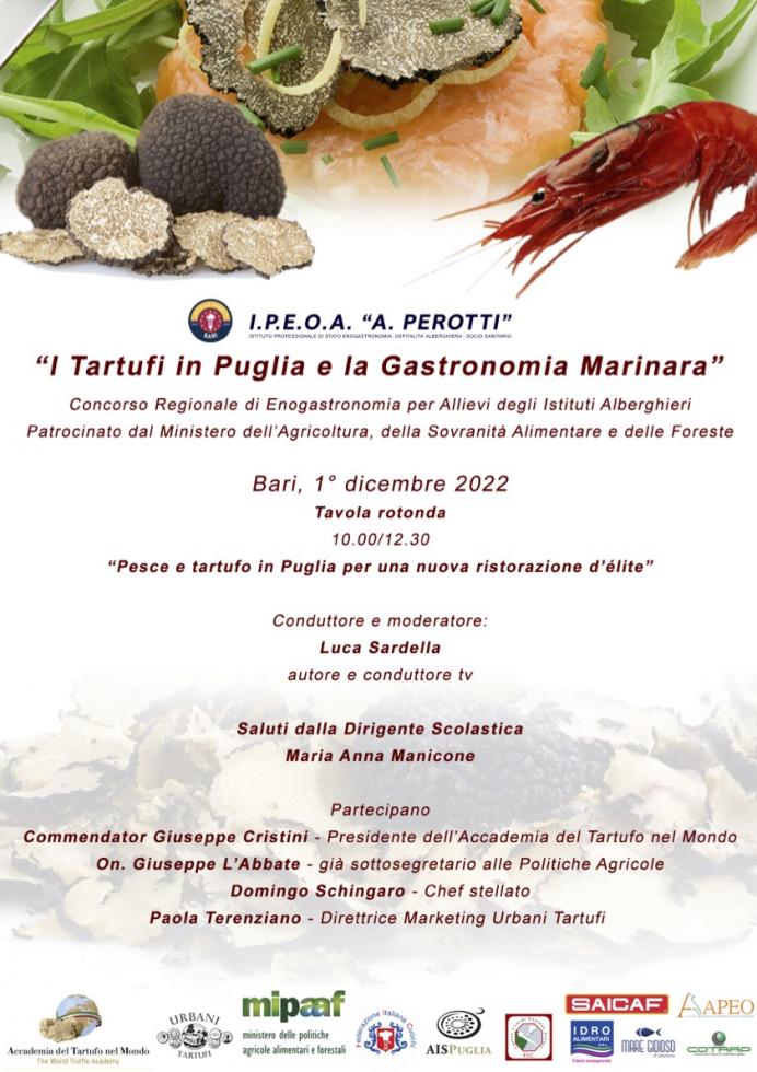 L’insolito e innovativo connubio pesce e tartufo giunge alla seconda edizione che, quest’anno, andrà in scena a Bari il prossimo 1° dicembre. Il concorso gastronomico “I tartufi in Puglia e la gastronomia marinara”, patrocinato dal Ministero dell’agricoltura, della sovranità alimentare e delle foreste, è rivolto agli allievi dell’ultimo anno di corso degli Istituti alberghieri pugliesi. Nato dall’idea dell’On. Giuseppe L’Abbate, già sottosegretario di Stato alle Politiche Agricole, e del Commendator Giuseppe Cristini, presidente dell’Accademia del Tartufo nel Mondo, è organizzato dall’IPEOA Perotti di Bari, vincitore della prima edizione con la studentessa Rebeca Paciullo.