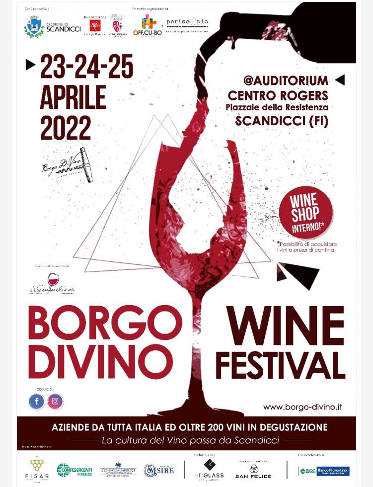 Borgo DiVino a Scandicci è stato organizzato da Officina CU.BO. Aps e Periscopio Comunicazione con il patrocinio del Comune di Scandicci, del Consiglio Regionale della Toscana e della Città Metropolitana, oltre alla collaborazione di FISAR Firenze, Confesercenti e Confcommercio Firenze ed il contributo del Banco Fiorentino Mugello-Impruneta-Signa e Bagni Assicurazioni.