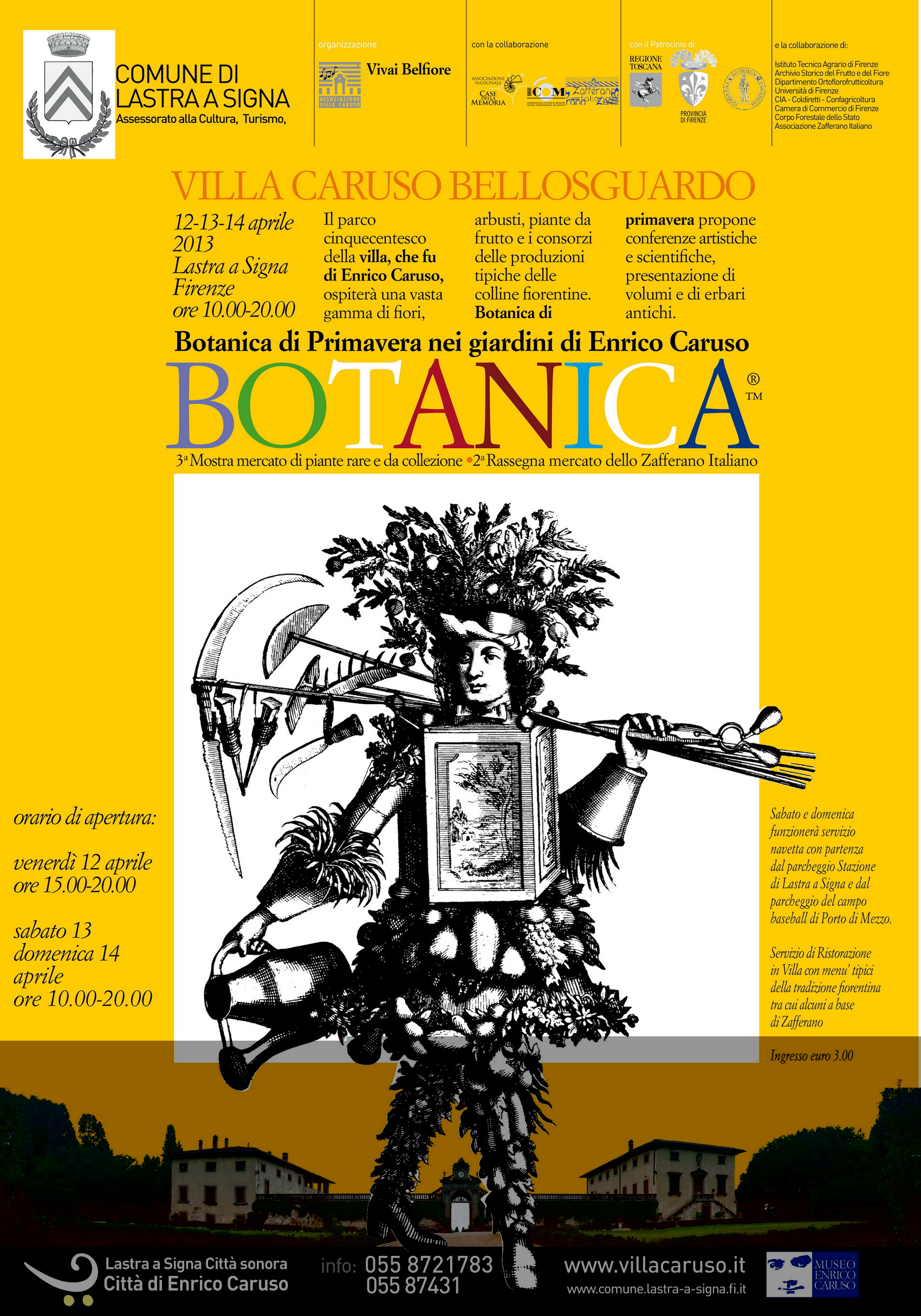 Il Comune di Lastra a Signa e l’Associazione Villa Caruso presentano al pubblico, agli espositori e agli amanti del giardinaggio Botanica- edizione primavera, una manifestazione che coniuga temi artistici, scientifici e di conoscenza e salvaguardia del patrimonio vegetale con particolare attenzione alle varietà antiche e dimenticate.