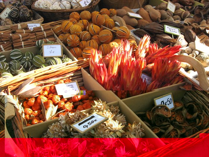 si' Marco si vedono limoni e arance essiccate, quello è uno stand francese unico nel suo genere espositivo in tutta la fiera. Vendeva frutti essiccati per decorazioni, frutti e semi esotici mai visti.