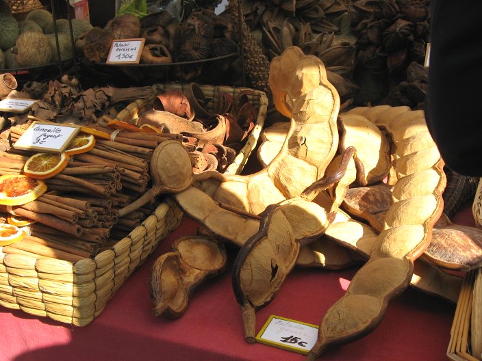 Facendo qualche viaggio all'estero, ho notato che esistono alberi maestosi ben oltre le nostre querce i cui semi e frutti hanno dimensioni gigantesche. Allego un'altra foto dello stesso stand dove mi avevano colpito quella specie di baccelli enormi che vedevo per la prima volta.