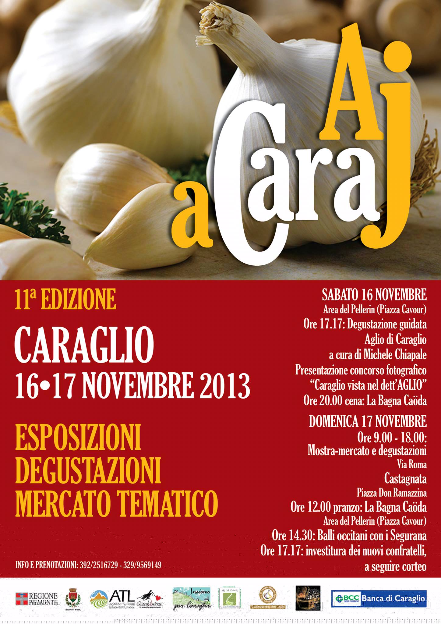 Si inizia, sabato 16, presso il rinnovato Pelerin di piazza Cavour, alle 17,17, con la degustazione guidata dell’aglio di Caraglio a cura del giovane chef caragliese Michele Chiapale. Seguirà l’accattivante concorso fotografico “ Caraglio nel dett’aglio”. Alle 20.00, presso il suddetto Pelerin, una sontuosa e fragrante bagna caoda allieterà i palati dei buongustai. Il giorno dopo, domenica 17, dalle 9 del mattino alle 18, lungo la strada e la piazza centrale del paese si terrà l’attesa “mostra- mercato- degustazione dell’aglio di Caraglio e di numerose e rare tipicità. Tra abbondanti ortaggi e frutta di qualità, amabili mieli e formaggi aromatici , stuzzichevoli salumi e vini profumati si potranno reperire delle rare eccellenze del nostro territorio. Come il delicato antico fagiolo bombonino, piccolo, dalla candida buccia, tenerissima e digeribilissima, adatto al forno o nel coccio piemontese. Oppure la gustosa lenticchia della Valle Grana che rivive nei nostri areali e le patate Piattine e Ciarde dei coltivatori dell’Associazione di tutela di Monterosso Grana. O, ancora, il Söfran ovvero il riscoperto, delizioso, Zafferano di Caraglio e della Valle Grana e i piccoli e saporiti porri quarantini, anche detti di montagna o di Montemale. Poi il borlotto nano Reginotto della Vallera, appositamente spaccato, come vuole l’antica tradizione, per una cottura rapida, fatidiche anche senza preventivo ammollo, in suadenti minestroni. E le farine della tradizione: il pregiato Barbarià o Barbariato, la farina pignoletto per un’ottima polenta, il grano saraceno, il farro e tantissimo altro ancora. Nell’intermezzo della festa, alle 12,00 verrà fortunatamente riproposta la gentile bagna caoda caragliese, presso il suddetto Pelerin. Il pomeriggio sarà allietato da danze occitane dei Segurana, condite da fragranti caldarroste. Al termine, gran finale con l’investitura di nuovi confratelli e, a seguire, appassionate corteo della Confraternita dell’aglio lungo la via principale. Ai buongustai, agli amanti della tradizione, ai contadini, ai gastronomi, a tutta la gente che mangia e sa che quello che mangia diventerà parte di se stesso, appuntamento il 16 e 17 novembre 2013, a Caraglio(Cuneo). Siete tutti aromaticamente invitati. Info: associazione Insieme per Caraglio 0171619816