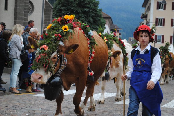 Ore 11.00- piazza S.S. Filippo e Giacomo e vie del centro Desmontegada de le Vache - Predazzo accoglie le mucche addobbate a festa che rientrano in paese dall’alpeggio estivo: sfilata per le vie del centro e conclusione al tendone dell’ottagono presso il minigolf