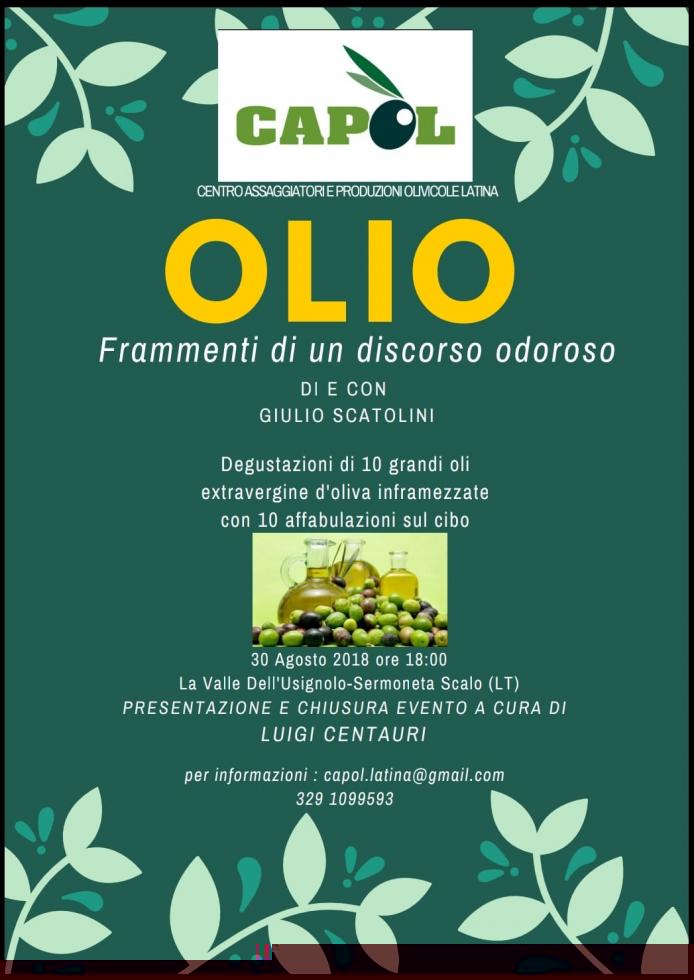 Degustazione di 10 grandi oli extravergine d’oliva inframezzate a 10 affabulazioni sul cibo. Appuntamento giovedì 30 Agosto a Sermoneta Scalo (LT), presso l’Agriturismo “La Valle dell’Usignolo”.