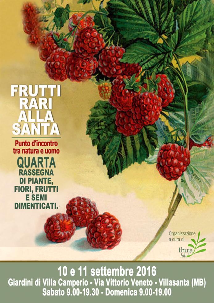 - Mostra fotografica nei giardini durante la manifestazione. “Dolce & salato” Breve viaggio nel mondo sommerso per immagini, riprese in acqua dolce e in mare. La Natura vista da sotto … a sopra, attraverso gli scatti di Aurelio Giussani, fotografo subacqueo affascinato dal “sesto continente”. RACCOLTA FONDI: La manifestazione è legata fortemente al territorio, vuole essere un punto di riferimento concreto per sostenere iniziative di crescita sociale e di solidarietà al servizio della comunità. Per questo motivo in occasione della manifestazione, verrà effettuata una raccolta fondi per sostenere il progetto “Autismo in campo” promosso dalla Coop Cascina Bianca di Milano. Il progetto vuole offrire alle persone affette da tale disabilità un’occasione di formazione, riconoscendo “talenti” che possano poi esprimersi ad ogni livello della filiera di lavoro. Frutti Rari alla Santa è organizzata da Thuja Lab Associazione di Promozione Sociale, con la collaborazione di Claudia Marchionni di Frutti Antichi del Castello di Paderna (PC) Si ringraziano: Proloco di Villasanta, Slow Food Monza e Brianza, Scuola Agraria del Parco di Monza, CNG Fisio, BuenaVista Occhiali, Il Vinattiere, Alma Birrificio, Teatro Manzoni di Monza