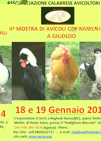 Montaggio gabbie espositive ed allestimento locali destinati alla Mostra: da lunedi 13 a mercoledì 15 gennaio 2014 Ingabbio: giovedì 16 gennaio dalle ore 10,00 alle ore 17,00 Giudizio: giovedì 16 gennaio ore 17,00 Giudizio: venerdì 17 gennaio dalle ore 9,00 alle 19,00. Esposizione:sabato 18 gennaio dalle ore 9,00 alle ore 21,00 domenica 16 dicembre 2012 dalle ore 8,30 alle ore 19,00 Sgabbio animali:domenica 19 dicembre dalle ore 17,00 alle ore 19,00 a seguire smontaggio delle gabbie fino al completo disimpegno del locale. Premiazione:domenica 19 gennaio alle ore 11,00.
