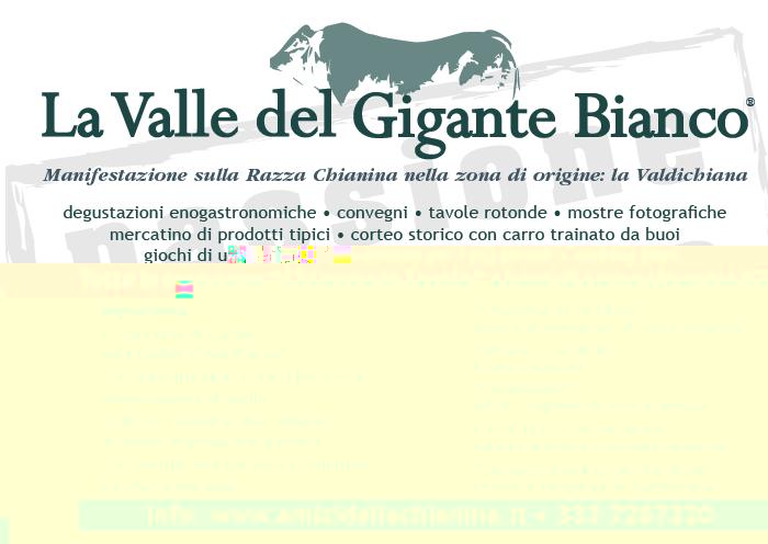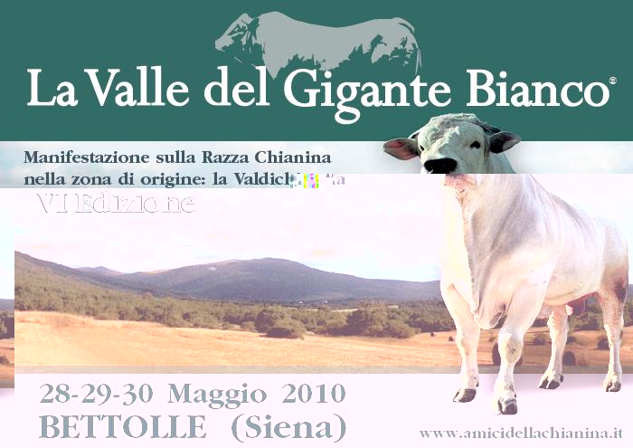 A Bettolle (SI), si svolgerà nei giorni 28 - 29 - 30 Maggio la Manifestazione “La Valle del Gigante Bianco”, giunta alla sesta edizione, organizzata dall’Associazione “Amici della Chianina”, nata per dar vita ad un evento storico –culturale dedicato alla razza chianina, IL BOVINO PIÙ GRANDE AL MONDO, con particolare riguardo al suo legame con la Valdichiana, sua zona di origine, e il suo utilizzo gastronomico.