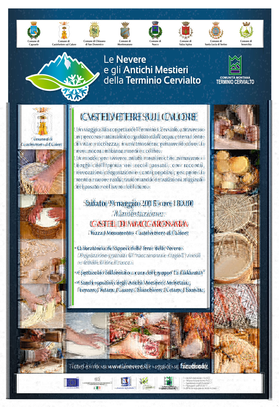 Dopo l’ottimo riscontro ottenuto con la tappa di Santa Lucia di Serino, l’evento itinerante “Le Nevere e gli Antichi Mestieri della Terminio Cervialto” è pronto ad essere ospitato presso il comune di Castelvetere sul Calore, dominato dall’antico Castello Longobardo e affacciato sul fiume da cui deriva il nome della cittadina. L’evento, che si terrà sabato 9 maggio a partire dalle ore 18,00, prende il nome di “Castel di Maccaronara”, ed è la quarta tappa dell’iniziativa promossa dalla Comunità Montana Terminio-Cervialto e finanziata nell'ambito del PSR Campania 2007-2013, Iniziativa PIRAP – Parco Regionale dei monti Picentini, Misura 313 - Incentivazione di attività turistiche. La manifestazione sarà dedicata, appunto, alla valorizzazione della maccaronara, formato di pasta locale fatta a mano e avente la forma di grosso spaghetto, preparata secondo un'antica ricetta irpina, semplice, ma molto saporita. Condita col sugo o con i fagioli, rappresenta un piatto tipico della cucina contadina, di cui a Castelvetere sul Calore, e in tutta l'area limitrofa, si conserva l'abilità manuale della lavorazione rigorosamente artigianale. La maccaronara sarà protagonista, assieme ad altri piatti della tradizione, del “Laboratorio dei sapori delle terre delle Nevere”, durante il quale i visitatori potranno scoprire e apprezzare i sapori del borgo del Terminio-Cervialto. Oltre al gusto non mancherà, come negli appuntamenti precedenti, la rievocazione degli antichi mestieri, con la presenza in stand dedicati ad alcune delle figure artigiane che un tempo animavano i borghi irpini, tra cui: la Merlettaia, il Furnaro (fornaio), il Pastaro (pastaia), il Casaro, il Chianchiere (macellaio), il Cestaio e l’Ebanista. Ad arricchire la serata vi sarà lo spettacolo teatrale “Il racconto delle Nevere”, a cura della Compagnia “La Carrozza d’Oro”, e l’esibizione del gruppo folkloristico “La Takkarata”, che proporrà un ricco repertorio di canti e danze popolari. Continua così il percorso alla scoperta dell’antico mondo legato alle “Nevere”, le costruzioni rurali un tempo utilizzate per l’immagazzinamento e la conservazione del ghiaccio nei mesi estivi, e dei mestieri caratteristici del periodo storico in cui esse venivano utilizzate. Un avvincente viaggio all’insegna della tradizione e della memoria, condito dai sapori tipici di alcuni dei borghi più belli della provincia di Avellino. Dopo Castelvetere sul Calore l’evento itinerante “Le Nevere e gli Antichi Mestieri della Terminio Cervialto” proseguirà presso il comune di Chiusano di San Domenico.