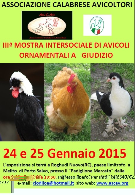 Sabato 24 e domenica 25 Gennaio, presso il "Padiglione Mercato" del comune di Roghudi Nuovo(RC), avverrà la ormai consueta esposizione di Avicoli Ornamentali organizzata dall'ASCAV -Associazione Calabrese Avicoltori-. Verranno esposte centinaia di esemplari di razze ornamentali di galline, colombi, oche e anatre particolarissime e provenienti da tutte le parti del mondo. Un'occasione per vedere, apprezzare ed incentivare la biodiversità del mondo avicolo. NON PERDETEVELA. L'ingresso sarà libero dalle ore 09:00 alle 19:30. Vi aspettiamo..... Clodiloa