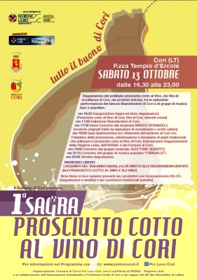 Sabato 13 Ottobre, a piazza del Tempio d’Ercole, si volgerà la prima edizione della Sagra del Prosciutto cotto al vino bianco di Cori, manifestazione ad ingresso libero organizzata dal Comune di Cori – Assessorato all’Agricoltura e Sportello Unico per le Attività Agricole – e dalla Pro Loco Cori, con il contributo dell’ARSIAL – Regione Lazio, in collaborazione con l’Associazione Volontariato e Protezione Civile di Cori e gli studenti dell’indirizzo alberghiero dell’IIS San Benedetto di Latina.