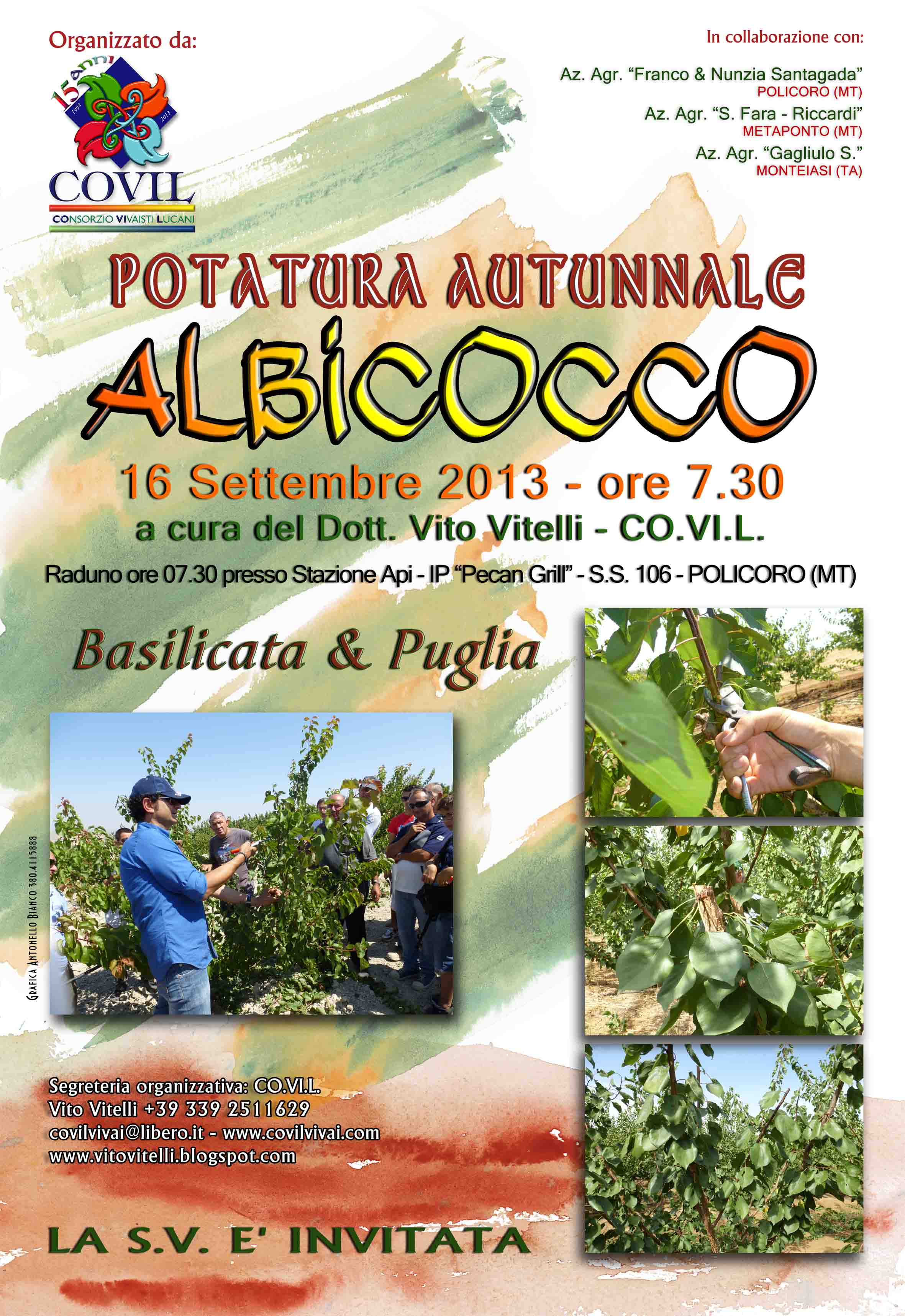 Lunedì 16 settembre 2013 in Basilicata e Puglia si svolgeranno prove dimostrative di potatura autunnale su albicoccheti di diversa età (da 1 a 5 anni). L'iniziativa, promossa e organizzata dal Consorzio Vivaisti Lucani di Scanzano Jonico (provincia di Matera), sarà curata dell'agronomo Vito Vitelli, general manager del CO.VI.L.
