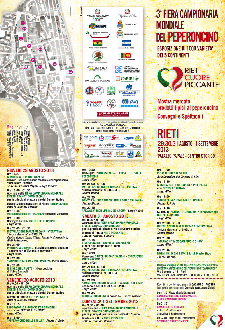 Fervono i preparativi della terza edizione di Rieti Cuore Piccante, Fiera Campionaria Mondiale del Peperoncino che si svolgerà da giovedì 29 agosto a domenica 1 settembre, con le piazze e le vie del centro storico di Rieti a fare da suggestivo scenario. Una tappa fondamentale per gli appassionati del nobile capsicum e anche per i semplici curiosi che quest’anno vedranno il loro piccante beniamino protagonista di una serie di eventi dove, a farla da padrona, sarà l’alta gastronomia.