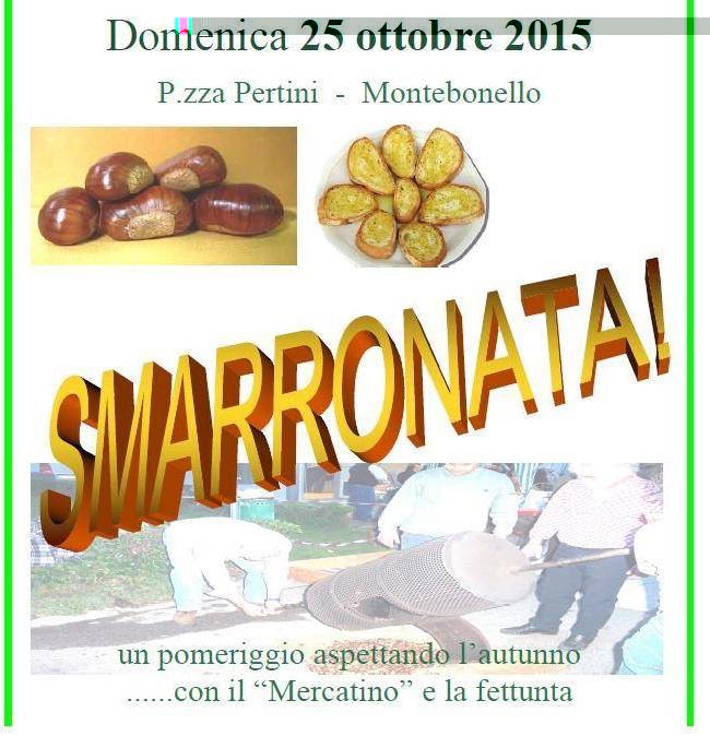 DOMENICA 25 OTTOBRE piazza Pertini a Montebonello si riempirà di sapori e colori d'autunno: la SMARRONATA! Fin dal mattino prenderà corpo il MERCATINO DELLA NONNA. Di pomeriggio invece "bruciate", fettunta e tante altre specialità al Chiosco. Dopo Profumo di Vacanze.....altri profumi vi aspettano!