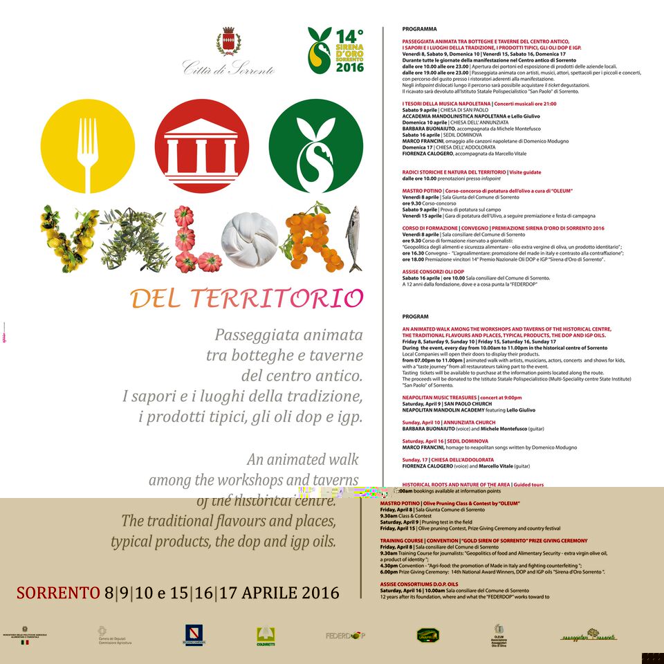 Sorrento. Al via l’edizione 2016 del Sirena d’Oro Due week-end, dall’8 al 10 e dal 15 al 17 aprile, interamente dedicati all’olio extravergine di oliva e ai prodotti tipici locali, con degustazioni, eventi e visite guidate Sei giorni di appuntamenti, tra degustazioni, mostre, concerti, visite guidate, convegni ed eventi. Al via venerdì 8 aprile, l’edizione 2016 del “Sirena d’Oro”, format dedicato all’olio extravergine di oliva e ai prodotti tipici locali, promosso dal Comune di Sorrento, in collaborazione con Coldiretti, Unaprol e Federdop, con il patrocinio della Camera dei Deputati, del ministero delle Politiche Agricole, Alimentari e Forestali e della Regione Campania. All’interno del contenitore si svolgono il “Premio Sirena d’Oro”, giunto alla 14ma edizione, concorso che ogni anno assegna riconoscimenti ad oli extravergine di oliva Dop e Igp di tutto il territorio nazionale, e “I Valori del Territorio”, un itinerario nel cuore di Sorrento, alla scoperta di tradizioni e tipicità enogastronomiche, condito da spettacoli ed eventi di intrattenimento. Il programma parte il giorno 8, dalle ore 10 alle 23, con l’apertura degli antichi portoni che si snodano lungo il centro storico, che ospiteranno fino al domenica 10 - e successivamente nel week-end dal 15 al 17 aprile - prodotti di aziende specializzate in settori che vanno dalle tipicità agroalimentari all’artigianato. Durante i due week-end “I Valori del Territorio” proporrà ai visitatori, dalle ore 19 alle 23, una “passeggiata animata” con artisti, musici, attori, spettacoli e concerti, e un “percorso del gusto” tra i ristoratori che aderiscono all’iniziativa. I ticket per le degustazioni di piatti e specialità della tradizione, con protagonisti naturalmente gli oli Dop e Igp, saranno in vendita al costo di 10 euro presso i due info point dislocati lungo il percorso, e il ricavato della vendita sarà devoluto all’Istituto Statale Polispecialistico San Paolo di Sorrento. Nei punti informazione sarà anche possibile prenotare al mattino visite guidate alla scoperta delle bellezze storiche, dei musei, degli agrumeti e degli uliveti sorrentini. Spazio anche alla musica classica napoletana con quattro i concerti in calendario, tutti con inizio alle ore 21: sabato 9 aprile, presso la chiesa di San Paolo, concerto dell’Accademia Mandolinistica Napoletana con Lello Giulivo, il 10 aprile, nella chiesa dell’Annunziata, Barbara Buonaiuto (voce solista dell’Orchestra Italiana di Renzo Arbore) accompagnata da Michele Montefusco, il 16 aprile, a Sedil Dominova, Marco Francini con “Meraviglioso”, un omaggio a Domenico Modugno e il 17 aprile, nella chiesa dell’Addolorata, l’esibizione di Fiorenza Calogero accompagnata da Marcello Vitale. Non mancano le giornate dedicate alla formazione e agli incontri con addetti ai lavori del settore agricoltura. Venerdì 8 aprile, la sala giunta del Comune di Sorrento ospita a partire dalle ore 9 “Mastro Potino”, un corso-concorso di potatura dell’olivo a cura di “Oleum”, che si concluderà il 15 aprile, con la premiazione dei vincitori. Sempre l’8 aprile, alle ore 9.30, presso la sala consiliare del Comune di Sorrento si terrà il corso di formazione riservato ai giornalisti sul tema “Geopolitica degli alimenti e sicurezza alimentare: olio extra vergine di oliva, un prodotto identitario: esigenze legislative e corretta informazione” che vedrà la partecipazione di Giuseppe Cuomo, sindaco di Sorrento, Colomba Mongiello, vice presidente della Commissione parlamentare d’inchiesta contro la contraffazione con delega all’agroalimentare, Ottavio Lucarelli, presidente dell’Ordine dei Giornalisti della Campania, Gennaro Masiello, vice presidente nazionale di Coldiretti, Amedeo De Franceschi, primo dirigente del Corpo Forestale dello Stato, Michele Bungaro, responsabile delle relazioni istituzionali del Consorzio Olivicolo Italiano e Giulio Scatolini capo panel dell’Unaprol, moderati da Luigi D’Alise, responsabile dell’ufficio stampa del Comune di Sorrento. Nel pomeriggio, alle ore 16.30, si svolge invece il convegno dal titolo “L’agroalimentare: promozione del made in Italy e contrasto alla contraffazione”, con interventi, tra gli altri, di Paolo Russo, componente della Commissione Agricoltura della Camera, del presidente di Unaprol David Granieri e del direttore di Coldiretti Campania Salvatore Loffreda. Alle ore 18, la premiazione dei produttori di olivo extravergine di oliva, vincitori della XIV edizione del Premio Sirena d’Oro: l’Azienda Agricola Carraia di Trequanda, nel senese, con la Dop Terre di Siena, per la categoria fruttato leggero, il Frantoio Galantino di Bisceglie, a Bitonto, con la Dop Terra di Bari, per la categoria fruttato medio e l’Azienda Agricola Romano Vincenzo di Bronte, nel catanese, con la Dop Monte Etna, per la categoria fruttato intenso. L’edizione 2016 del Sirena d’Oro si chiuderà il 16 aprile, nella sala consiliare del Comune di Sorrento, a partire dalle ore 10, con l’assise nazionale dei consorzi degli oli Dop, promossa da “Federdop”. "L'obiettivo del Sirena d'Oro è quello di illustrare al consumatore finale quali sono le caratteristiche superiori degli oli extravergine d'oliva a marchio Dop e Igp, affinché possano effettuare scelte d'acquisto consapevoli” – sottolinea il sindaco di Sorrento, Giuseppe Cuomo - I cittadini e gli ospiti che parteciperanno all'evento avranno modo di partecipare a degustazioni di oli con l'aiuto di assaggiatori professionisti, potendo così conoscere ed apprezzare le loro qualità organolettiche e salutistiche". Per l’assessore agli Eventi del Comune di Sorrento, Mario Gargiulo “Le tipicità agroalimentari rappresentano un forte attrattore per il turismo. Dall’olio extravergine di oliva al vino, dal limoncello ai pomodori, dai formaggi alle noci, il nostro territorio offre un vasto ventaglio di prodotti di grande qualità. Il tutto un