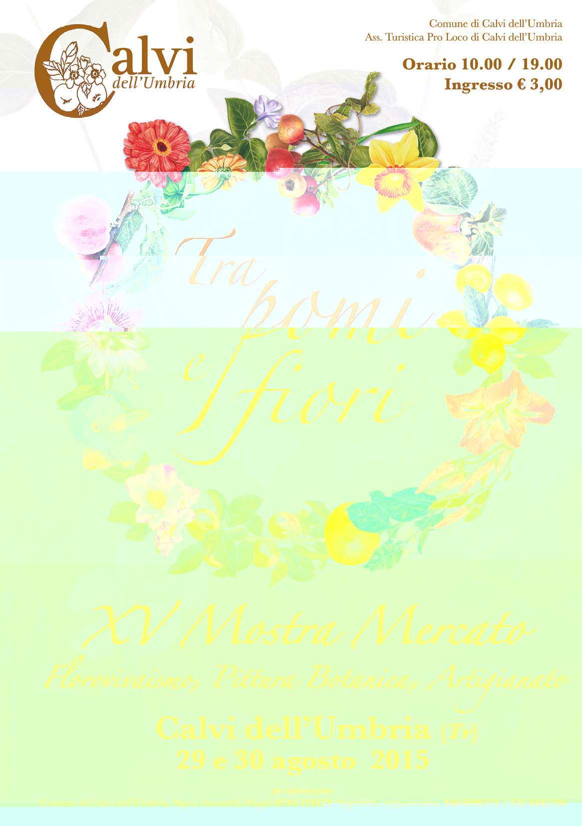 A Calvi dell’Umbria (TR) nei giorni 29 e 30 Agosto 2015, XV mostra-mercato di florovivaismo “Tra pomi e fiori ”. L’evento, il primo del genere svoltosi in Umbria,avra’luogo nel centro storico che nei due giorni della manifestazione sara’animato dalla presenza di vivaisti selezionati,provenienti da diverse regioni italiane che metteranno a disposizione dei visitatori le loro produzioni e la loro esperienza ,tali da soddisfare un po’tutti gli appassionati di giardinaggioe del mondo del verde