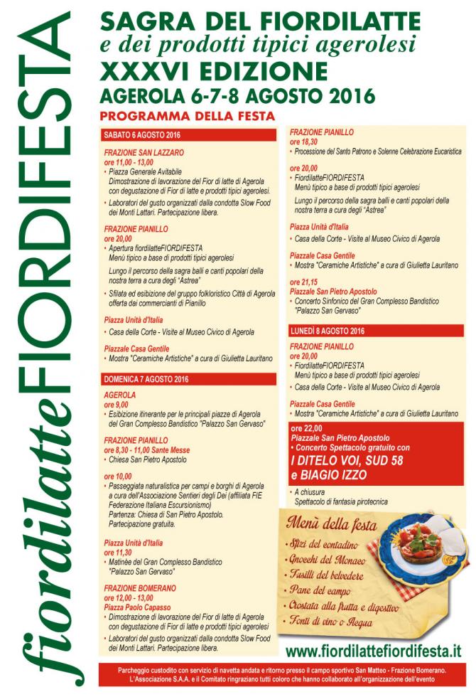 XXXVI sagra del Fiordilatte FIORDIFESTA ad Agerola tre giorni di gusto Ritorna la manifestazione più attesa dell'estate in Campania: FiordilatteFIORDIFESTA, la sagra del fiordilatte e dei prodotti tipici agerolesi si svolgerà dal 6 all'8 agosto. Nella splendida cornice del comune di Agerola, situato sui monti Lattari a due passi dal primo tratto della Costiera Amalfitana, tra Positano e Amalfi, il gusto autentico dei prodotti tipici del luogo diventa protagonista dell'evento FiordilatteFIORDIFESTA. La sagra del fiordilatte, organizzata dall'Associazione Sant'Antonio Abate, si terrà da sabato 6 agosto a lunedì 8 agosto 2016. Conosciuto e apprezzato in Italia e in molti paesi dell'Europa e del mondo, grazie alle sue caratteristiche organolettiche, è un formaggio fresco a pasta filata, ottenuto dalla lavorazione di latte fresco bovino locale, allevato secondo tradizione. Il fiordilatte è un alimento gustoso e genuino che ha acquisito valore grazie ad una lunga tradizione produttiva tramandata e riscoperta nel tempo. Buono sia come piatto singolo, sia abbinato ad altre pietanze, è spesso utilizzato come ingrediente speciale nella preparazione di altri piatti. La XXXVI edizione della sagra "FiordilatteFIORDIFESTA " sarà l'occasione perfetta per poter degustare e apprezzare i prodotti artigianali tipici della città di Agerola come i gustosi salumi, le deliziose caciotte, ricotte, scamorze e il pregiato Provolone del Monaco DOP. Il pane di Agerola, prodotto ancora con una parte di farina di segale, la pasta di Gragnano e il vino di Furore, accompagneranno degnamente le specialità locali. Il programma della manifestazione, ricco e variegato vedrà protagonista lo speciale menù tipico preparato per l'occasione, ricco di pietanze che coinvolgeranno il fiordilatte con grande originalità. Tra i piatti preparati secondo l'antica tradizione agerolese i visitatori potranno assaggiare gli Gnocchi del Monaco e i Fusilli del belvedere, gli speciali sfizi del contadino o il classico panino con caciocavallo e pancetta, anche detto Pane del Campo. In occasione della XXXVI edizione, saranno organizzati percorsi guidati al Museo Civico di Agerola, sarà possibile visitare la mostra "Ceramiche Artistiche" a cura di Giulietta Lauritano ed esplorare il mercatino di prodotti tipici allestito presso il giardino parrocchiale. Durante la manifestazione sarà possibile assistere alle dimostrazioni di lavorazione del fiordilatte di Agerola e prendere parte ai laboratori del gusto organizzati dalla condotta dei Monti Lattari di Slow Food. Inoltre, domenica 7 agosto, è in programma una passeggiata naturalistica per campi e borghi di Agerola a cura dell'Associazione Sentieri degli Dei (affiliata FIE – Federazione Italiana Escursionismo) per scoprire le bellezze artistiche e quelle naturalistiche del territorio. La manifestazione sarà animata dalla musica del Gran Complesso Bandistico "Palazzo San Gervaso", dai canti e balli popolari degli "Astrea" e dal gruppo folkloristico "Città di Agerola". L'atteso spettacolo finale di lunedì 8 agosto vedrà alternarsi sul palco di Piazzale san Pietro Apostolo i famosi comici di Made in Sud: I ditelo voi, i Sud 58 e il grande Biagio Izzo, per uno show aperto a tutti, divertente e gratuito. In chiusura lo spettacolo di fantasia pirotecnia. Agerola è un territorio incontaminato che si estende a ferro di Cavallo sul declivio dei monti Lattari, il comune offre ai visitatori e agli ospiti della sagra "FiordilatteFIORDIFESTA" un soggiorno d'eccellenza tra gusto e bellezze naturali. Grazie al suo clima mite, gli spazi verdi e le vedute meravigliose sul mare, sia dalla località San Lazzaro che si affaccia a strapiombo sul blu del mediterraneo e sovrasta in linea retta la città di Amalfi, sia da Punta San Lazzaro; inoltre, per lo straordinario percorso panoramico del Sentiero degli Dei che, da Agerola a Nocelle, sovrasta la Costiera Amalfitana, è una meta turistica di forte impatto, da vivere e scoprire almeno una volta nella vita.
