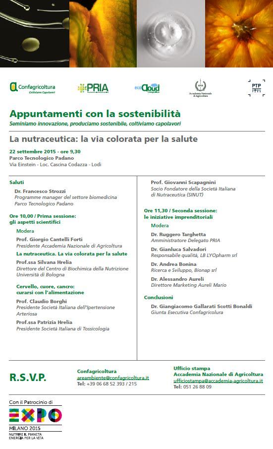 “La Nutraceutica: la via colorata per la salute” che si terrà il 22 settembre 2015, alle ore 9.30 al Parco Tecnologico Padano, Via Einstein - Loc. Cascina Codazza – Lodi.