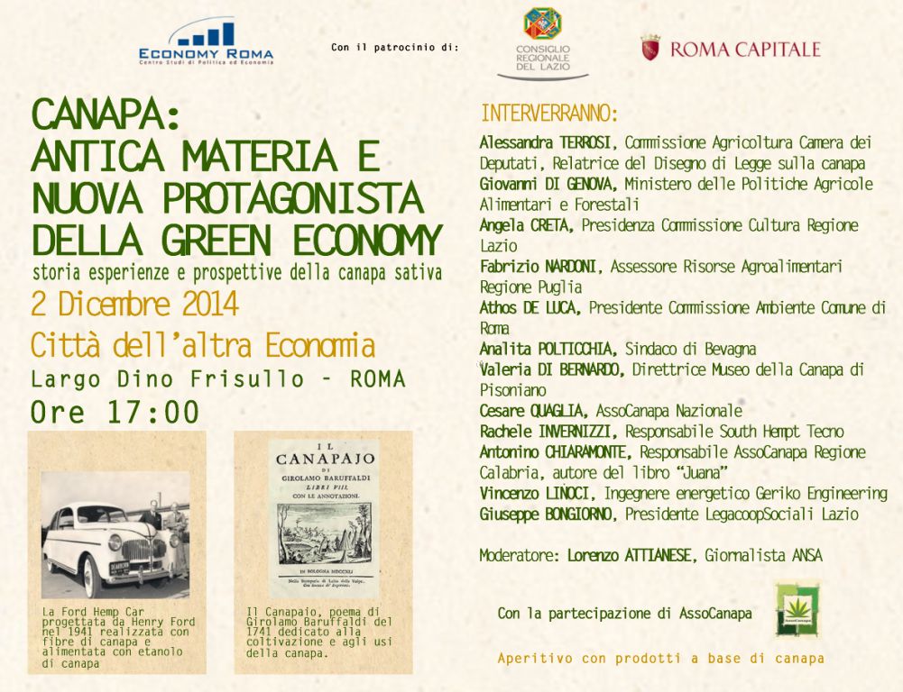 Convegno organizzato da Economy Roma con la collaborazione di AssoCanapa, a Roma il giorno 2 dicembre presso Città dell'Altra Economia largo Frisullo 17 alle ore 17