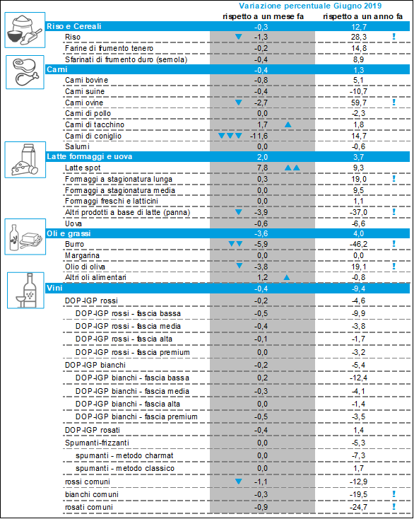 Nel comparto degli oli e grassi rimangono in calo i prezzi di burro e olio di oliva. Il burro ha perso a giugno un ulteriore 5,9%, di fatto dimezzandosi rispetto allo scorso anno (-46,2%). Anche i listini degli oli di oliva hanno segnato un nuovo ribasso mensile (-3,8%), pur mantenendosi più elevati del 19,1% rispetto all’anno precedente. Oltre agli effetti dell’abbondante produzione spagnola, in questa fase i listini dell’olio di oliva stanno risentendo anche delle aspettative positive sulla produzione italiana nella prossima annata.