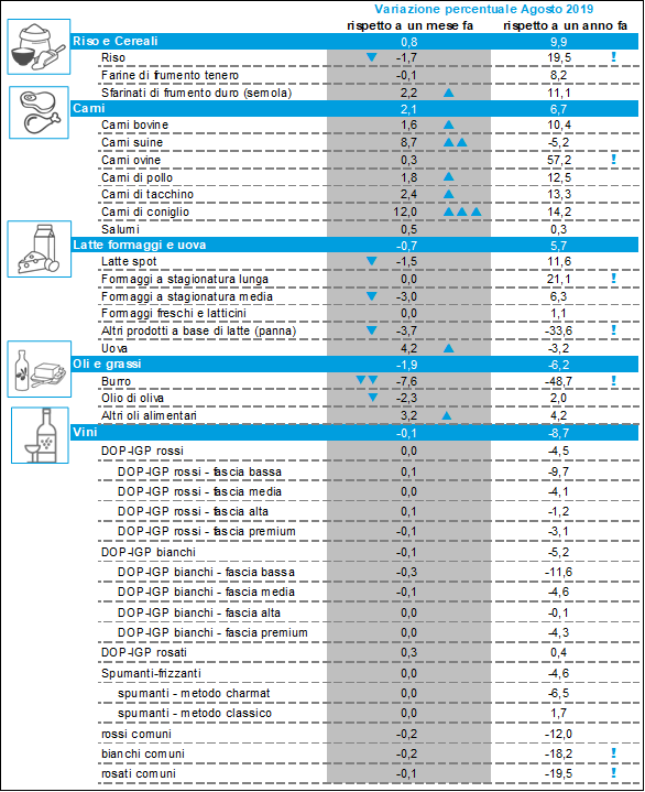 Nel comparto degli oli e grassi non si fermano invece i ribassi per i prezzi dell’olio di oliva, scesi ad agosto del 2,3% rispetto a luglio. Con le operazioni di raccolta delle olive al via, le quotazioni continuano a risentire delle stime produttive indicanti un forte recupero rispetto al 2018. Il nuovo calo mensile – il sesto consecutivo – ha riportato i prezzi dell’olio di oliva sugli stessi livelli dello scorso anno (+2%). Confronto anno su anno che resta pesantemente negativo per il burro, con i prezzi attuali dimezzati rispetto a dodici mesi fa (-48,7%).
