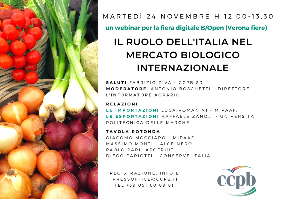 Martedì 24 novembre, in occasione della fiera B/Open CCPB organizza un webinar dal titolo Il ruolo dell'Italia nel mercato biologico Internazionale. B/Open è la nuova fiera (digitale) dedicata al canale professionale del biologico. Con l'aiuto di illustri esperti e analisti del settore, CCPB vuole offrire ai visitatori una panoramica del mercato partendo da quanto e come l'Italia esporta prodotti bio nel mondo, è il secondo paese che lo fa maggiormente, per e da quanto e come invece il nostro paese ricorre a prodotti e materie prime estere, per soddisfare il proprio fabbisogno e produzione. A seguire, alcune importanti aziende potranno dare il loro punto di vista sulle dinamiche del mercato. La registrazione è obbligatoria, basta scrivere una mail a pressoffice@ccpb.it o cliccare qui sotto