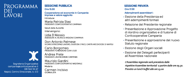 I lavori si apriranno con la Tavola rotonda “Cooperazione ed economia in Campania: imprese e valore aggiunto” alla quale interverranno: Lidia D’Alessio, Assessore al Bilancio Regione Campania, Don Antonio Palmese, Vicario episcopale Lavoro, Giustizia e Pace, Carità Arcidiocesi di Napoli, Carlo Borgomeo, Presidente Fondazione Con il Sud, Andrea Prete, Presidente Unioncamere Campania, Maurizio Gardini, Presidente Confcooperative Nazionale e Maria Patrizia Stasi, Presidente Confcooperative Campania.