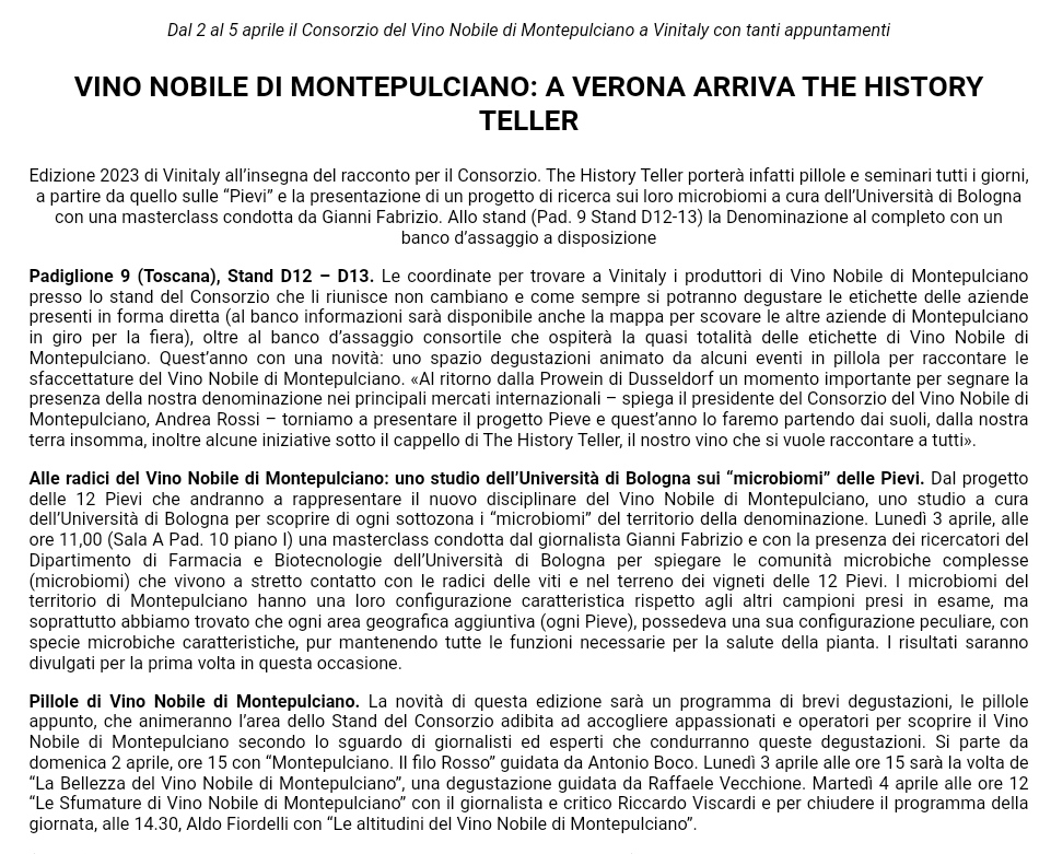 L’Anteprima del Vino Nobile di Montepulciano rientra come sempre nella Settimana delle “Anteprime di Toscana” inaugurata da PrimAnteprima, l'evento promosso da Regione Toscana insieme alla Camera di Commercio di Firenze e organizzato da PromoFirenze e Fondazione Sistema Toscana.