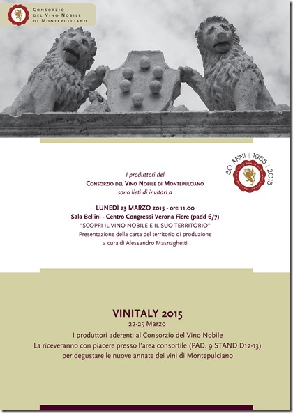 Il Consorzio del Vino Nobile di Montepulciano sarà presente a Vinitaly dal 22 al 25 marzo 2015. Le coordinate per scoprire i prestigiosi vini di Montepulciano in degustazione nell'ampia area del Consorzio, con le nuove annate in degustazione di Rosso e Vino Nobile di Montepulciano, sono le seguenti: PAD 9 (Toscana) Stand D12/D13.