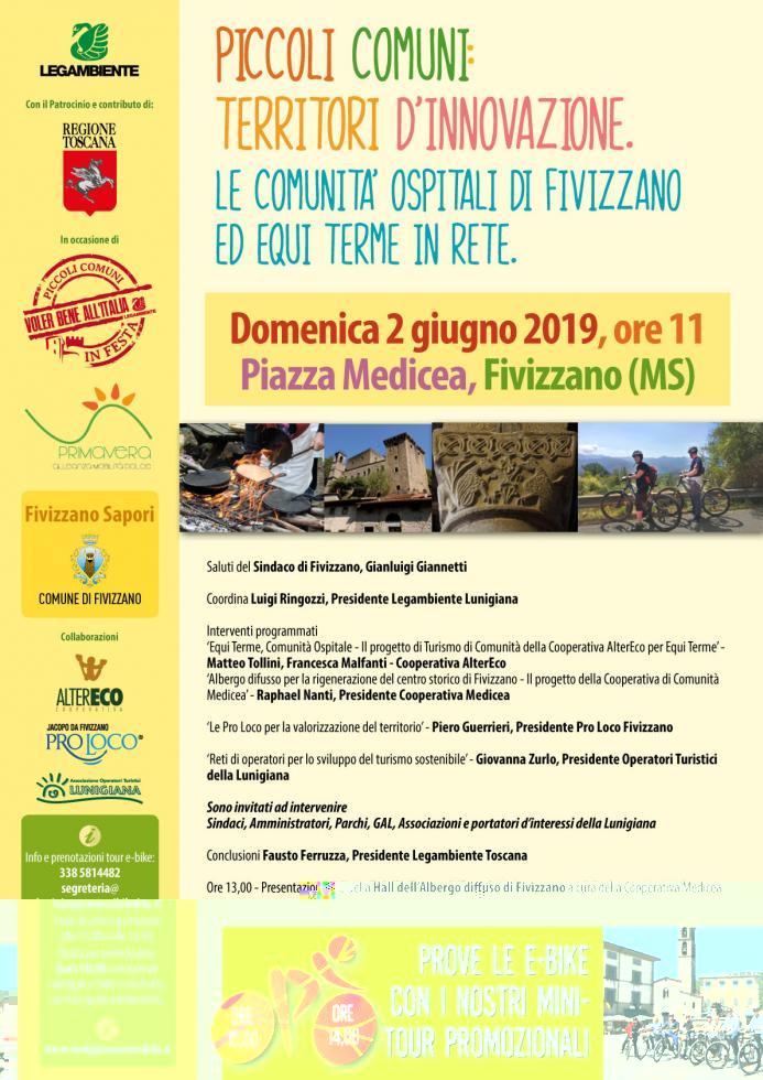 programma Saluti del Sindaco di Fivizzano, Gianluigi Giannetti Coordina Luigi Ringozzi, Presidente Legambiente Lunigiana Interventi programmati ‘Equi Terme, Comunità Ospitale – Il progetto di Turismo di Comunità della Cooperativa AlterEco per Equi Terme’ – Matteo Tollini, Francesca Malfanti – Cooperativa AlterEco ‘Albergo difusso per la rigenerazione del centro storico di Fivizzano – Il progetto della Cooperativa di Comunità Medicea’ – Raphael Nanti, Presidente Cooperativa Medicea ‘Le Pro Loco per la valorizzazione del territorio’ – Piero Guerrieri, Presidente Pro Loco Fivizzano ‘Reti di operatori per lo sviluppo del turismo sostenibile’ – Giovanna Zurlo, Presidente Operatori Turistici della Lunigiana Sono invitati ad intervenire Sindaci, Amministratori, Parchi, GAL, Associazioni e portatori d’interessi della Lunigiana Conclusioni Fausto Ferruzza, Presidente Legambiente Toscana Ore 13,00 – Presentazione della Hall dell’Albergo diffuso di Fivizzano a cura della Cooperativa Medicea Durante la giornata PROVE LE E-BIKE CON I NOSTRI MINI-TOUR promozionali I tour di un’ora partiranno alle 10,00 e alle 14,00. Quota per partecipante: Euro 10,00 (comprende noleggio e-bike e caschetto, servizio guida ambientale).