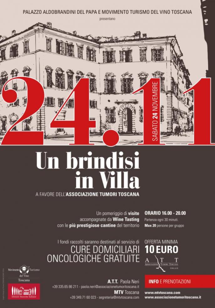 Sabato 24 novembre al via il ciclo di incontri promossi da MTV Toscana alla scoperta delle ville toscane Un Brindisi in villa: bellezza, arte e vino per sostenere l’ATT Il primo evento in programma per sabato a Palazzo Aldobrandini del Papa nel cuore di Firenze: un nuovo modo di scoprire le eccellenze vinicole regionali entrando nelle più belle ville storiche della Toscana che per la prima volta apriranno in via eccezionale al pubblico degli appassionati. In collaborazione con Adsi per sostenere il servizio di Cure Domiciliari Oncologiche gratuite dell’ATT, il Movimento Turismo del Vino Toscana promuove un’occasione unica per scoprire ricchezze artistiche, enologiche con una finalità nobile Tutto pronto per sabato 24 novembre, quando all’interno del Palazzo Aldobrandini del Papa di Firenze, prenderà il via l’evento “Un brindisi in villa”, il nuovo ciclo di incontri promosso dal Movimento Turismo del Vino Toscana che per la prima volta aprirà le porte di spettacolari ville monumentali e di dimore storiche del territorio regionale, normalmente chiuse al pubblico e svelate per la prima volta con visite guidate per scoprirne i tesori nascosti tra arte e bellezza, parchi monumentali e giardini all’italiana. Il tutto potendo degustare le eccellenze enologiche di oltre dieci cantine socie di MTV Toscana che saranno presenti direttamente con il produttore per dare vita a questo insolito connubio di passioni e di emozioni che scaturiscono dal bello dell’arte e dal buono dei vini. L’evento, che vedrà numerosi appuntamenti in diverse ville toscane, è realizzato con la preziosa collaborazione dell’Associazione Dimore Storiche Italiane (Adsi) e ha la nobile finalità di contribuire, con il ricavato dell’offerta per l’ingresso, a sostenere alcune realtà territoriali, nel primo caso l’attività dell’Associazione Tumori Toscana (ATT). «Il bello della Toscana che abbiamo già evidenziato con l’ultima edizione di Cantine Aperte si ritrova anche nelle tante ville sparse nella Toscana e questo evento è stato pensato per gli appassionati della bellezza – spiega il presidente del Movimento Turismo del Vino Toscana, Violante Gardini – questi monumenti grazie a questa iniziativa si sveleranno al pubblico con un aperitivo inusuale, il tutto con la finalità di sostenere ATT nel servizio di cure domiciliari oncologiche gratuite, perché insieme possiamo essere più forti e lanciare un messaggio positivo». Il programma e le cantine del primo appuntamento. La data scelta per il primo evento è sabato 24 novembre a Palazzo Aldobrandini del Papa, in piazza Madonna Aldobrandini, nel cuore di Firenze, città simbolo della bellezza e dell’accoglienza. Un’occasione unica per gli amanti delle meraviglie dal momento che l’evento si svolgerà in un appartamento privato all’interno di un palazzo in pieno centro storico, di fronte all’ingresso delle cappelle medicee (tra il mercato di San Lorenzo e Santa Maria Novella), normalmente chiuso al pubblico. Ad accogliere gli appassionati e a guidarli nelle stanze della loro dimora storica saranno i padroni di casa che, eccezionalmente, ospiteranno le aziende vinicole. L’evento si protrarrà dalle 16, orario di apertura, fino alle 20 e si potrà accedere attraverso un’offerta minima di 10 euro che comprenderà la visita guidata dell’appartamento (ogni 30 minuti), il calice e la pettorina porta bicchiere di MTV Toscana. Per questo primo evento saranno oltre dieci le aziende presenti con il produttore: dal Brunello di Montalcino al Carmignano Docg, passando per il Chianti e altri territori vinicoli toscani. Saranno presenti Buccia Nera, Capezzana, Col d’Orcia, Donatella Cinelli Colombini Az. Agricola - Casato Prime Donne, Fattoria del Colle, Fattoria dei Barbi, Marini Giuseppe, Melini, Podere dell’Uliveto, Poggio del Moro, Tenuta Mocenni-Bindi Sergardi, Terreno, Villa La Ripa. Per le prenotazioni alle visite e alla serata è possibile contattare l’indirizzo segreteria@mtvtoscana.com indicando nell’oggetto “Brindisi in Villa”. L’intero programma è disponibile su www.mtvtoscana.comIl ricavato dei biglietti per ATT. L’evento Un Brindisi in Villa vuole essere come detto anche una occasione di beneficienza e di riflessione nei confronti di problematiche attuali: parte del ricavato verrà devoluta infatti ad una realtà operativa nel territorio toscano che ospita l’iniziativa e in questo caso verrà dunque donato all’Associazione Tumori Toscana con la quale il Movimento ha già collaborato nel dicembre 2013 con un’asta benefica organizzata presso la cantina Antinori, nel Chianti Classico. In particolare le offerte della serata saranno destinate al servizio di Cure domiciliari oncologiche gratuite. Scopo principale della Onlus nata nel 1999 è quello di migliorare la qualità di vita di pazienti e familiari, permettendo ai pazienti di vivere a casa la loro malattia, grazie ad un’équipe polispecialistica di medici, psicologi, infermieri professionali, ed operatori socio-sanitari L'Associazione Movimento Turismo del Vino Toscana è un ente non profit che raccoglie circa 100 fra le più prestigiose cantine del territorio, selezionate sulla base di specifici requisiti, primo fra tutti quello della qualità dell'accoglienza enoturistica. Obiettivo dell’associazione è promuovere la cultura del vino attraverso le visite nei luoghi di produzione con eventi storici come Cantine Aperte che, oltre al tradizionale appuntamento di maggio, ormai si è moltiplicato con Cantine Aperte in Vendemmia e Cantine Aperte a Natale che si svolgerà il prossimo dicembre in tutta la Toscana. Ai turisti del vino il Movimento vuole, da una parte, far conoscere più da vicino l’attività e i prodotti delle cantine aderenti, dall’altra, offrire un esempio di come si può fare impresa nel rispetto delle tradizioni, della salvaguardia dell'ambiente e dell'agricoltura di qualità. Per far questo è stato creato un portale, www.mtvt