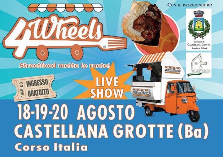 Dal 18 al 20 agosto la carovana di Streetfood torna in Puglia dopo il successo di Alberobello FoodTruck: a Castellana Grotte arriva Streetfood su ruote L’Associazione Nazionale Streetfood porta il progetto “4Wheels” del cibo di strada su ruote nella cittadina pugliese. Decini di cibi di strada diversi serviti sui “food truck”. Un ricco programma di interventi per sottolineare anche l’aspetto culturale del cibo di strada