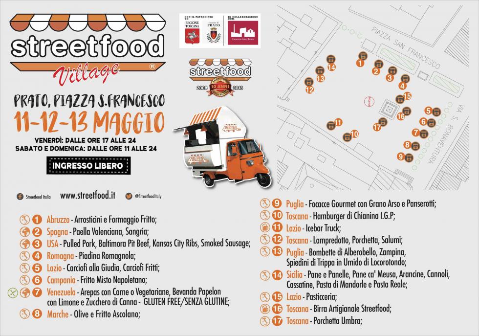 I cibi di strada presenti Non mancano i cibi di strada della tradizione come lo street food tradizionale siciliano: Pane e panelle, pane ca’ meusa, arancine e cannoli; dalla Campania la pasticceria tradizionale con le sue sfogliatelle e babà oltre a Caciocavallo impiccato dell’Irpinia. Impera la Puglia tra la Valle d’Itria e la Capitanata: Bombette di Alberobello e zampina, puccia con polpo, riso patate e cozze e focaccia barese dall’area di Barletta-Andria-Trani e la focaccia di grano arso condita con prodotti tradizionali e i mitici panzerotti. Determinante è anche la presenza di cibi etnici: dalla più europea paella valenciana e sangria ai cibi del Sudamerica come l’asado argentino e le empanadas e le arepas del Venezuela a base di pasta di mais e quindi senza glutine. Dall’estero anche Pulled Pork e RIbs, cottura al Barbecue a bassa temperatura, tipica statunitense ma con prodotto tutto italiano come la carne di mora romagnola. Il tutto annaffiato da ottima birra artigianale selezionata da Streetfood. Nella mappa allegata si trova l’elenco completo dei cibi e loro ubicazione.