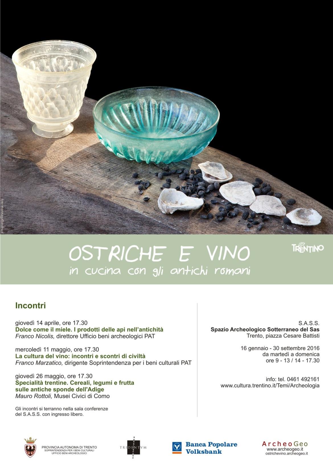 Come mangiavano i nostri antenati nella preistoria? C’è una linea di continuità nella storia dell'alimentazione dall’antichità ai giorni nostri? Come si sono evoluti nel corso dei secoli il significato del cibo e le tradizioni ad esso legate? Sono queste le tematiche al centro di un ciclo di tre incontri nell'ambito della mostra “Ostriche e vino. In cucina con gli antichi romani”. Gli appuntamenti, curati dall'Ufficio beni archeologici della Soprintendenza per i beni culturali della Provincia autonoma di Trento si terranno il 14 aprile, l’11 e il 26 maggio presso il S.A.S.S., lo Spazio Archeologico Sotterraneo del Sas, a Trento, sotto piazza Cesare Battisti.
