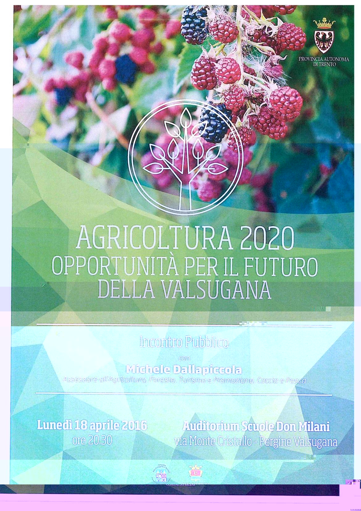 L'incontro, intitolato “Agricoltura 2020 opportunità per il futuro della Valsugana”, si terrà alle ore 20.30, a Pergine Valsugana presso l’Auditorium delle Scuole Don Milani (via Monte Cristallo).