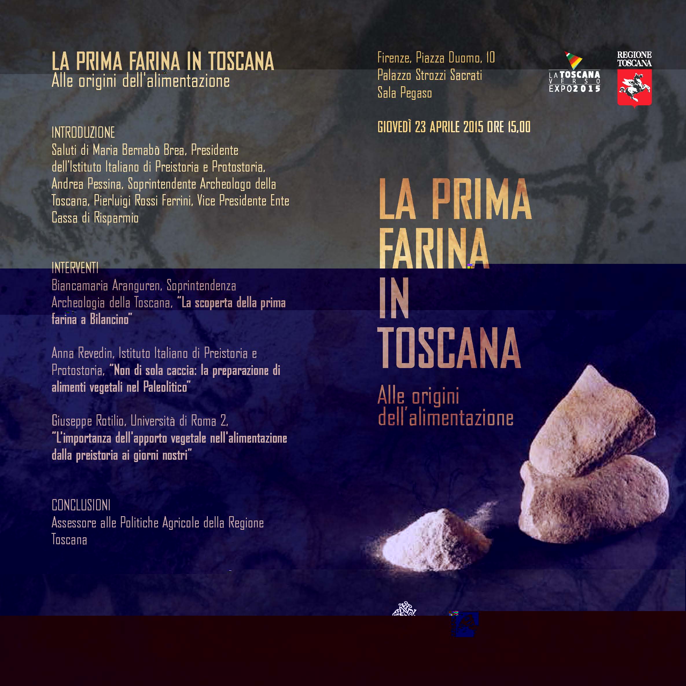 L'evento "La prima farina in Toscana" è stato organizzato dalla Regione Toscana in collaborazione con l'Istituto Italiano di Preistoria e Protostoria, la più prestigiosa istituzione del nostro Paese in questo campo, l'Ente Cassa di Risparmio di Firenze, la Soprintendenza Archeologica della Toscana. La Regione aveva contribuito agli scavi archeologici mentre l'Ente Cassa di Risparmio di Firenze ha sostenuto le fasi ulteriori della ricerca dell'IIPP. Questi temi saranno anche oggetto di una mostra che si terrà a settembre nella sede dell'Ente Cassa, in via Bufalini a Firenze, e che rientra fra le iniziative della Toscana sui temi di Expo. Le conclusioni della giornata sono state effettuate dall'assessore regionale all'agricoltura che ha anche la delega per il coordinamento delle iniziative della Toscana per Expo 2015.
