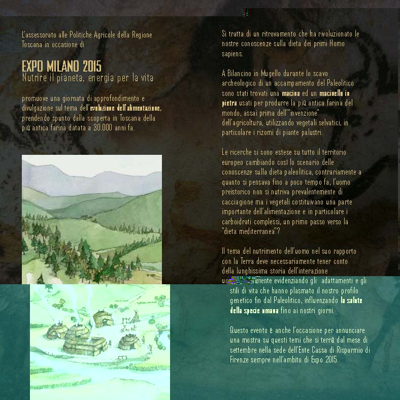 FIRENZE – E' la farina più antica del mondo ed è stata scoperta in Toscana. La scoperta, che rivoluziona le conoscenze sugli uomini del Paleolitico e sulla loro alimentazione, è stata presentata questo pomeriggio a Firenze, durante un evento, intitolato "La prima farina in Toscana- Alle origini dell'alimentazione" , volto ad approfondire il tema dell'evoluzione dell'alimentazione, che si è tenuto a Palazzo Strozzi Sacrati e inserito nella cornice di Expo 2015. E' una storia di 30 mila anni fa e nasce nella zona di Bilancino, dove, sulle rive della Sieve, una gruppo di homo sapiens ebbe un suo insediamento temporaneo. Passarono i millenni e negli anni 1995-1996, prima che la zona finisse sotto le acque dell'invaso di Bilancino, un gruppo di ricerca archeologica guidato da Biancamaria Aranguren della Soprintendenza Archeologica della Toscana in collaborazione con Anna Revedin dell'Istituto Italiano di Preistoria e Protostoria, effettua la scoperta.