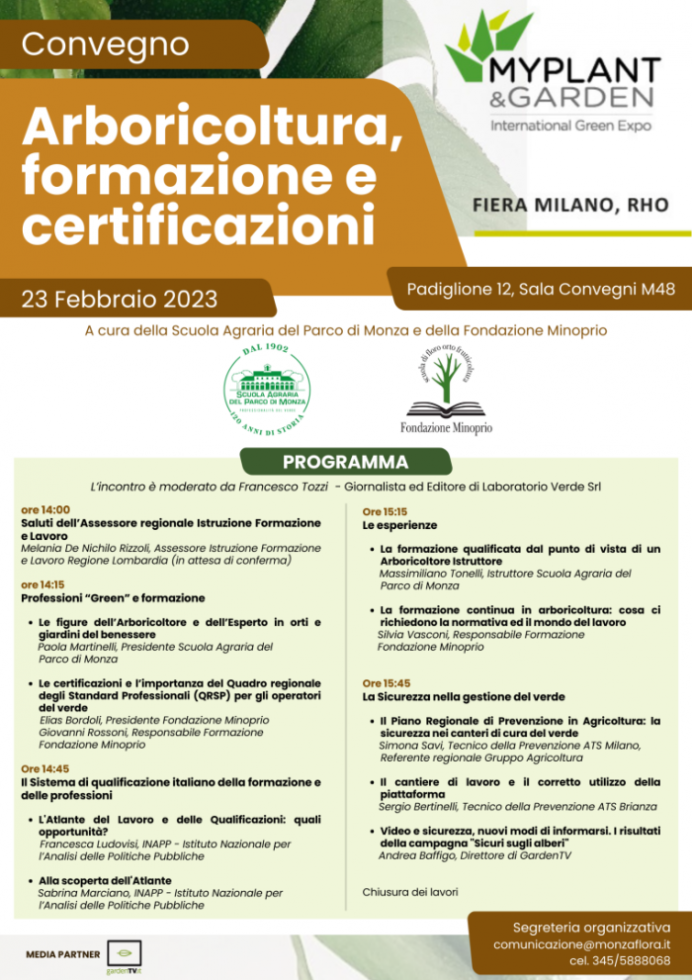 Convegno “Arboricoltura, formazione e certificazioni”, Giovedì 23 Febbraio alle ore 14:00 in Fiera Myplant & Garden. Da tempo gli alberi e il verde in generale, richiedono sempre più professionalità. L’arboricoltura è una vera e propria disciplina che necessita di conoscenze e competenze con aggiornamenti continui che attingono nuovi saperi nel mondo scientifico e tecnico. Per questa ragione, Myplant &Garden, una delle più importanti manifestazioni di promozione del verde produttivo e di cura del verde, ospita il convegno “Arboricoltura, formazione e certificazioni”. Possibilità per i nostri corsisti ed ex allievi di ricevere il biglietto omaggio per la Fiera. Per info: comunicazione@monzaflora.it