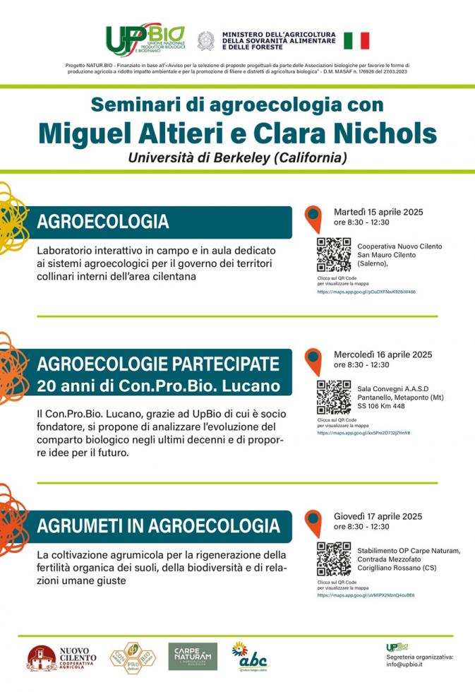 Il 15, 16 e 17 Aprile 2025, in Campania, Basilicata e Calabria https://www.upbio.it/promozione-informa ... biologica/ si terranno giornate di approfondimento sull’agroecologia con Miguel Altieri e Clara Nichols della University of California (Berkley), massimi esperti della materia.