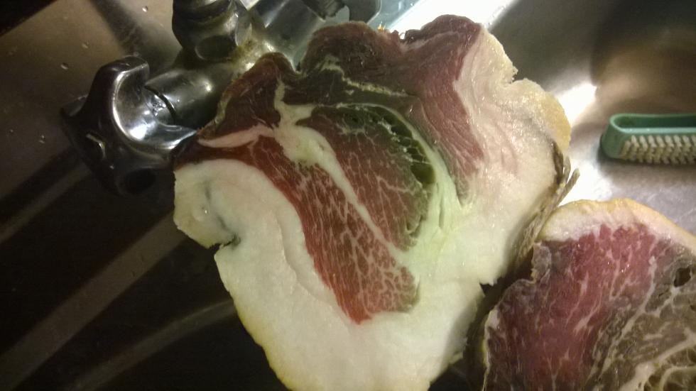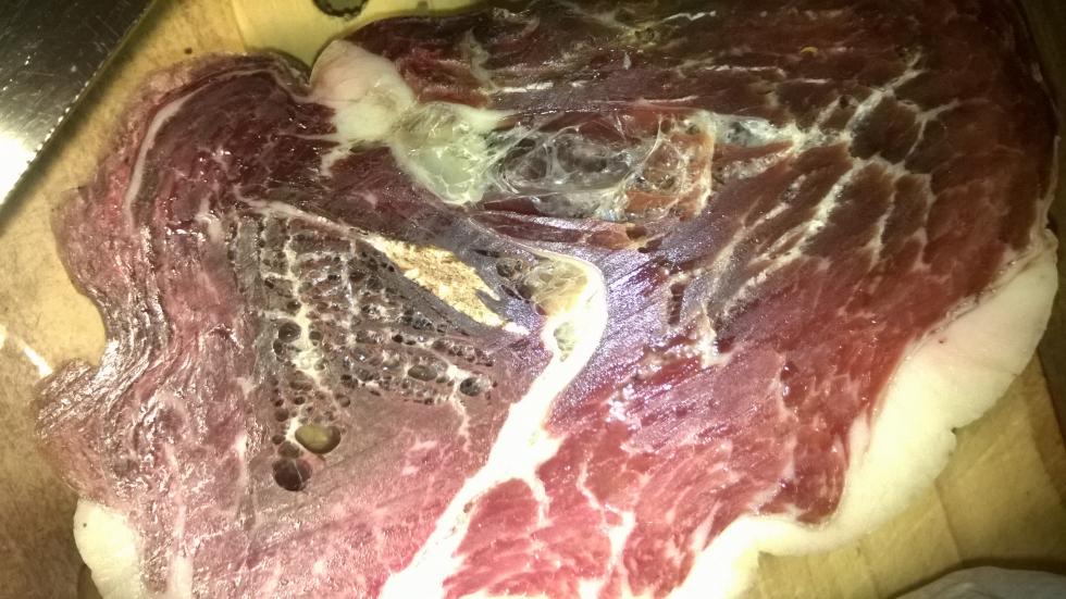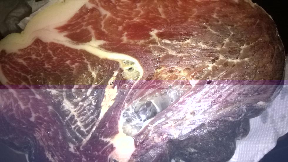 Buonasera, mi sono appena iscritto al forum e scrivo dalla provincia di Modena. Da tre anni mi diletto nella produzione per uso personale di salumi, coppe, salami, pancette e bresaole. Devo dire che i successi, nonostante la breve o quasi assente esperienza, sono da imputare alla scoperta, a suo tempo, di questo forum. Da queste pagine infatti ho letto i consigli ed i suggerimenti che mi hanno permesso di imparare per sbagliare il meno possibile. L'anno scorso, ad inizio dicembre 2015, ho deciso di provare ad insaccare tre culatelli. Il primo l'ho tagliato dopo 11 mesi, a novembre, ed era perfetto. Oggi, dopo 13/14 mesi, ho tagliato prima il secondo nel quale ho trovato problemi, in seguito il terzo che mi ha mostrato sostanzialmente gli stessi problemi. Allego alcune foto di entrambi per non dilungarmi nella descrizione del problema. La procedura utilizzata per tutti e tre è la seguente: Isolati i pezzi carnei dalle rispettive cosce, li ho legati stretti con quattro passaggi orizzontali. Messi a salare con 3 per cento di sale medio e un poco di pepe smezzato, sono rimasti 10 giorni in frigorifero a 7/8 gradi. Il 3 per cento di sale l'ho messo per metà circa il primo giorno, poi quotidianamente ne ho aggiunto fino al quinto sesto giorno, quando è terminato I culatelli freschi pesavano tra i 7 e gli 8 chili l'uno. Finita la salagione li ho sciacquati con un bicchiere di vino bianco, asciugati e messi in vescica. Fatto otto giri di corda in verticale e poi i classici passaggi fitti in orizzontale. Stufatura di 36 ore a 21/23 gradi poi messi in ambiente con T di circa 14/15 gradi e 70/80 per cento di umidità. In questo ambiente stagiono anche otto mesi le coppe, i salami rimangono morbidi anche dopo 4 mesi etc.. non ho mai avuto problemi. Chiedo gentilmente se qualche esperto riesce a capire dalle foto quale problema mi ha rovinato la festa. Grazie in anticipo e complimenti per il forum...gran bella iniziativa oltre che utilissima